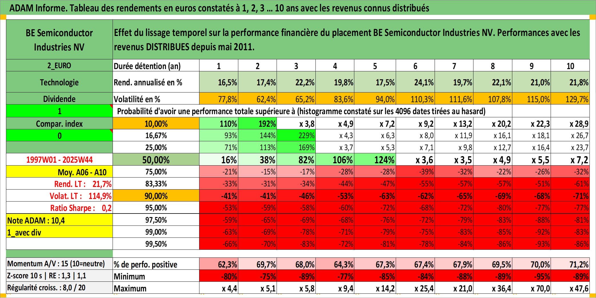 Site dédié aux investisseursPage dédiée sur site financeAnalyse des valorisations hebdomadaires de l'action BE Semiconductor Industries NV. Cet actif est cote en EUR. Les valorisations couvrent les semaines 1997W01 a 2025W44. Les revenus de cet actif financier sont pris en compte depuis la semaine 2011W18. La note ESG de cet actif n'est pas connue.