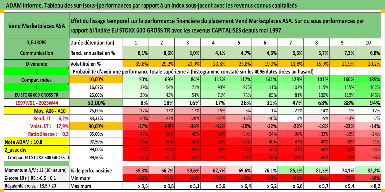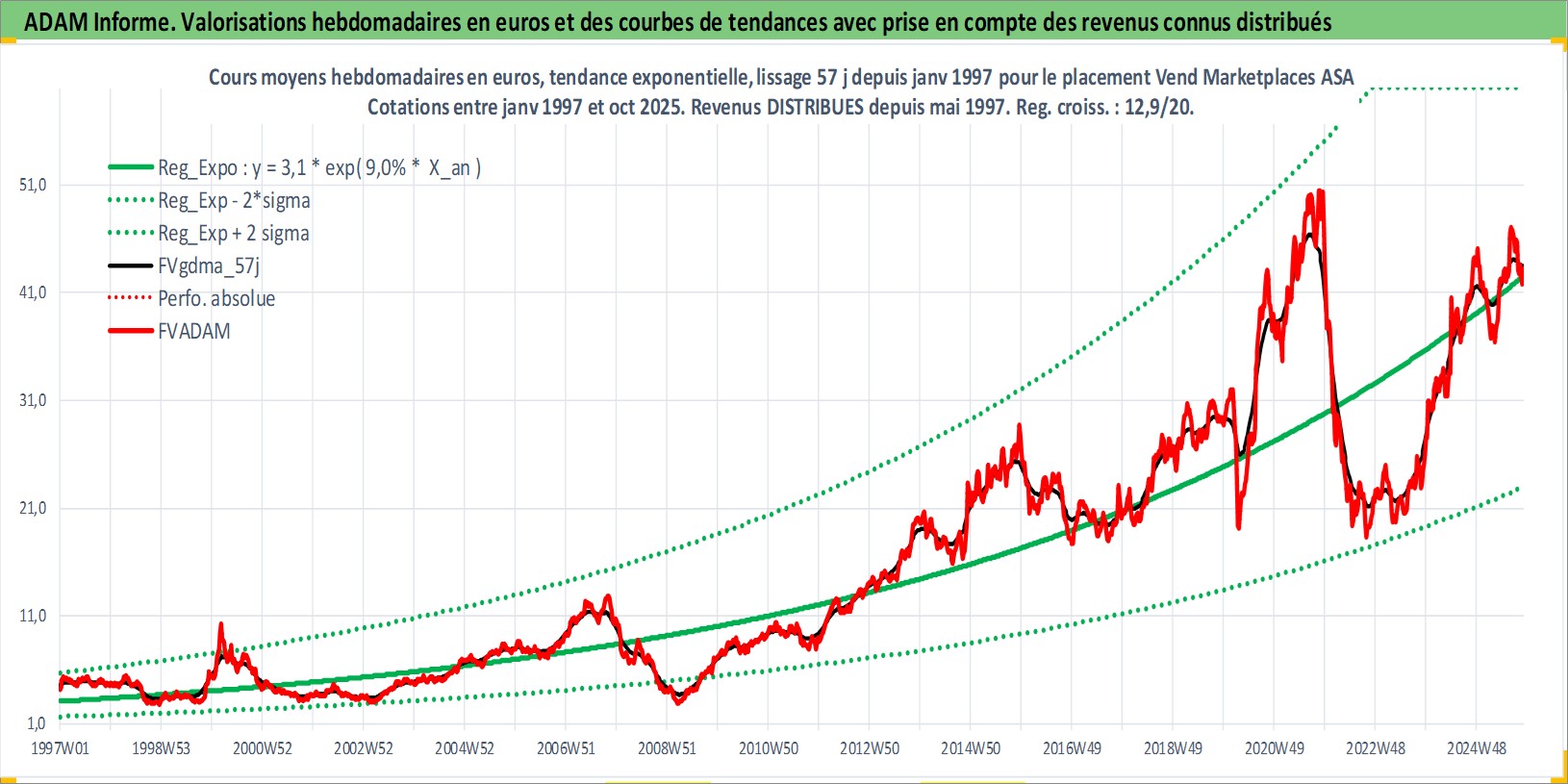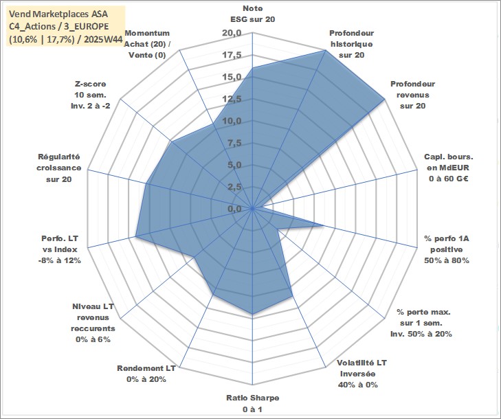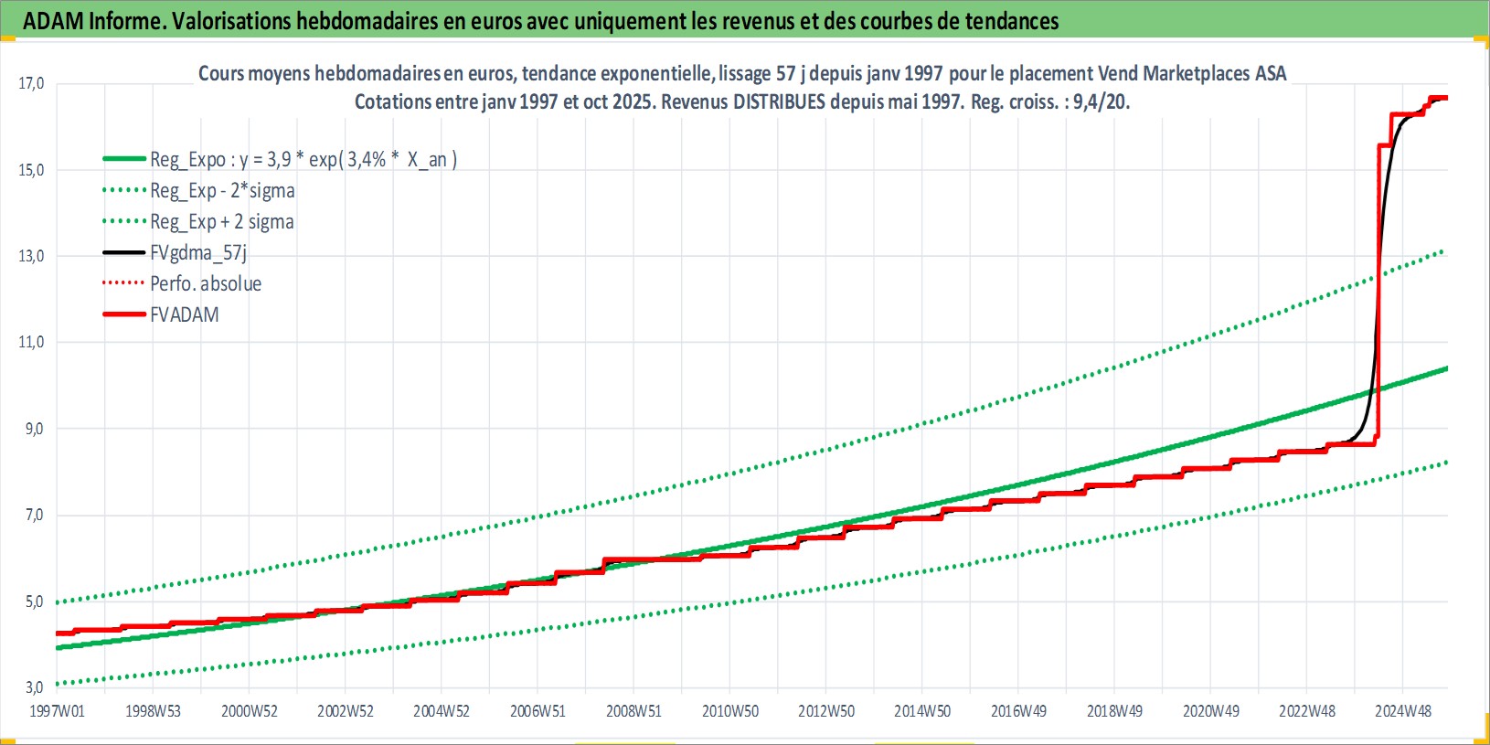 Site dédié aux investisseursPage dédiée sur site financeAnalyse des valorisations hebdomadaires de l'action Vend Marketplaces ASA. Cet actif est cote en NOK. Les valorisations sont en contrevaleur EURO et couvrent les semaines 1997W01 a 2025W44. Les revenus de cet actif financier sont pris en compte depuis la semaine 1997W20. La note globale ESG de cet actif est estimee a 16.0 (apres rebasage entre 0 et 20).