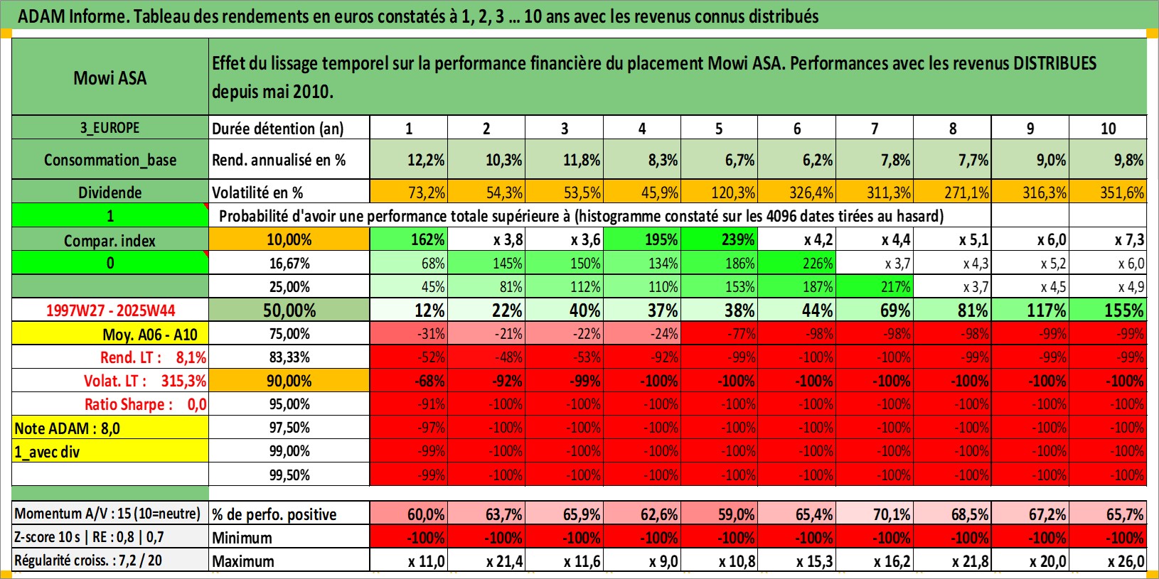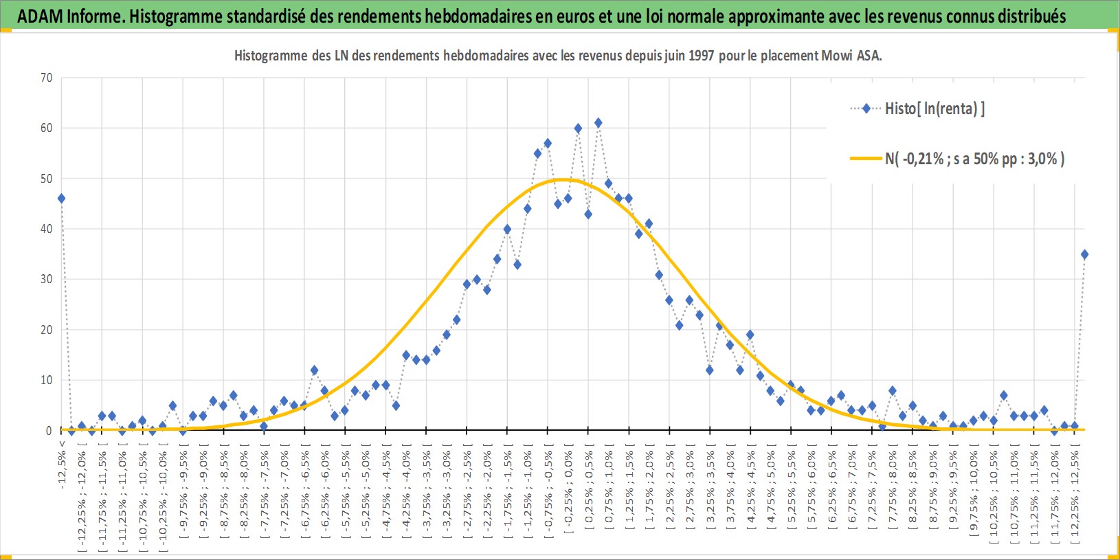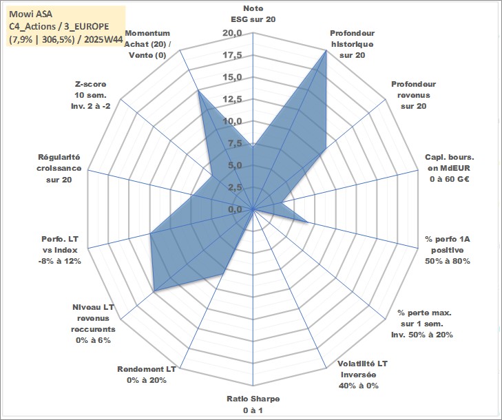 Site dédié aux investisseursPage dédiée sur site financeAnalyse des valorisations hebdomadaires de l'action Mowi ASA. Cet actif est cote en NOK. Les valorisations sont en contrevaleur EURO et couvrent les semaines 1997W27 a 2025W44. Les revenus de cet actif financier sont pris en compte depuis la semaine 2010W21. La note globale ESG de cet actif est estimee a 7.0 (apres rebasage entre 0 et 20).
