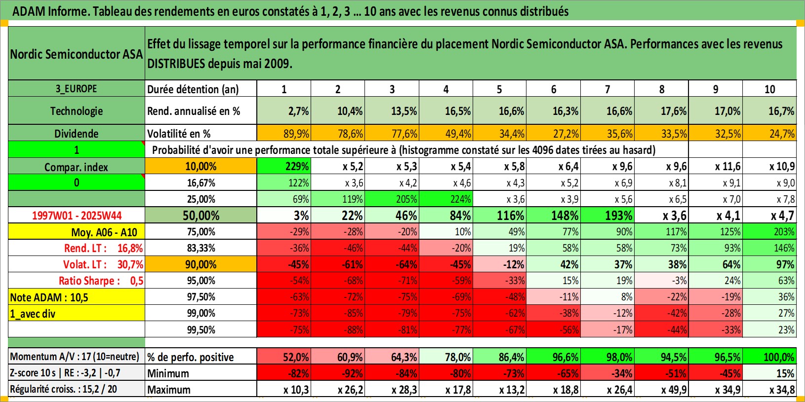 Site dédié aux investisseursPage dédiée sur site financeAnalyse des valorisations hebdomadaires de l'action Nordic Semiconductor ASA. Cet actif est cote en NOK. Les valorisations sont en contrevaleur EURO et couvrent les semaines 1997W01 a 2025W44. Les revenus de cet actif financier sont pris en compte depuis la semaine 2009W19. La note ESG de cet actif n'est pas connue.