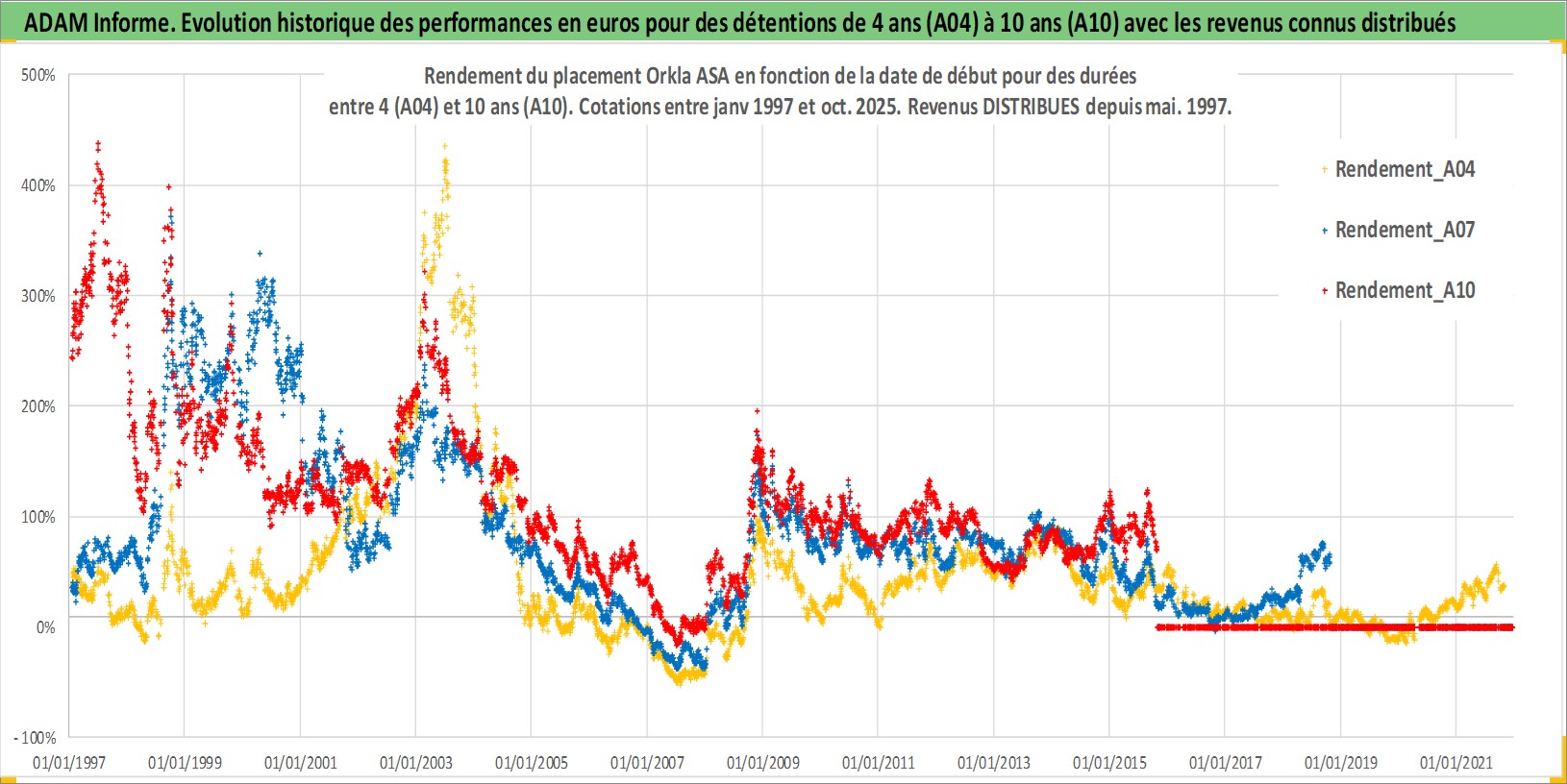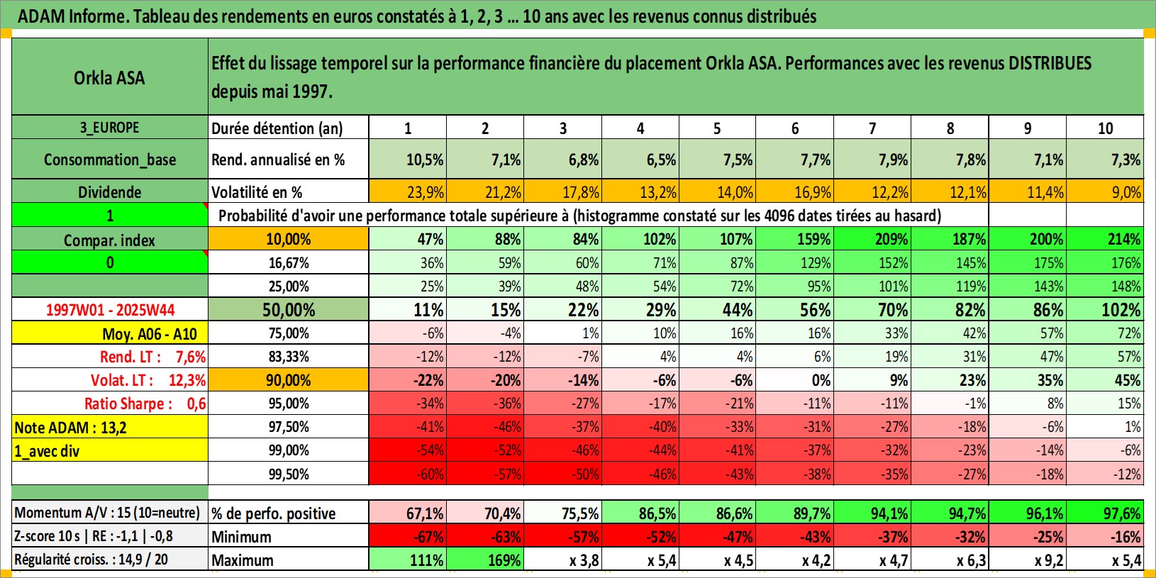 Site dédié aux investisseursPage dédiée sur site financeAnalyse des valorisations hebdomadaires de l'action Orkla ASA. Cet actif est cote en NOK. Les valorisations sont en contrevaleur EURO et couvrent les semaines 1997W01 a 2025W44. Les revenus de cet actif financier sont pris en compte depuis la semaine 1997W19. La note globale ESG de cet actif est estimee a 11.0 (apres rebasage entre 0 et 20).