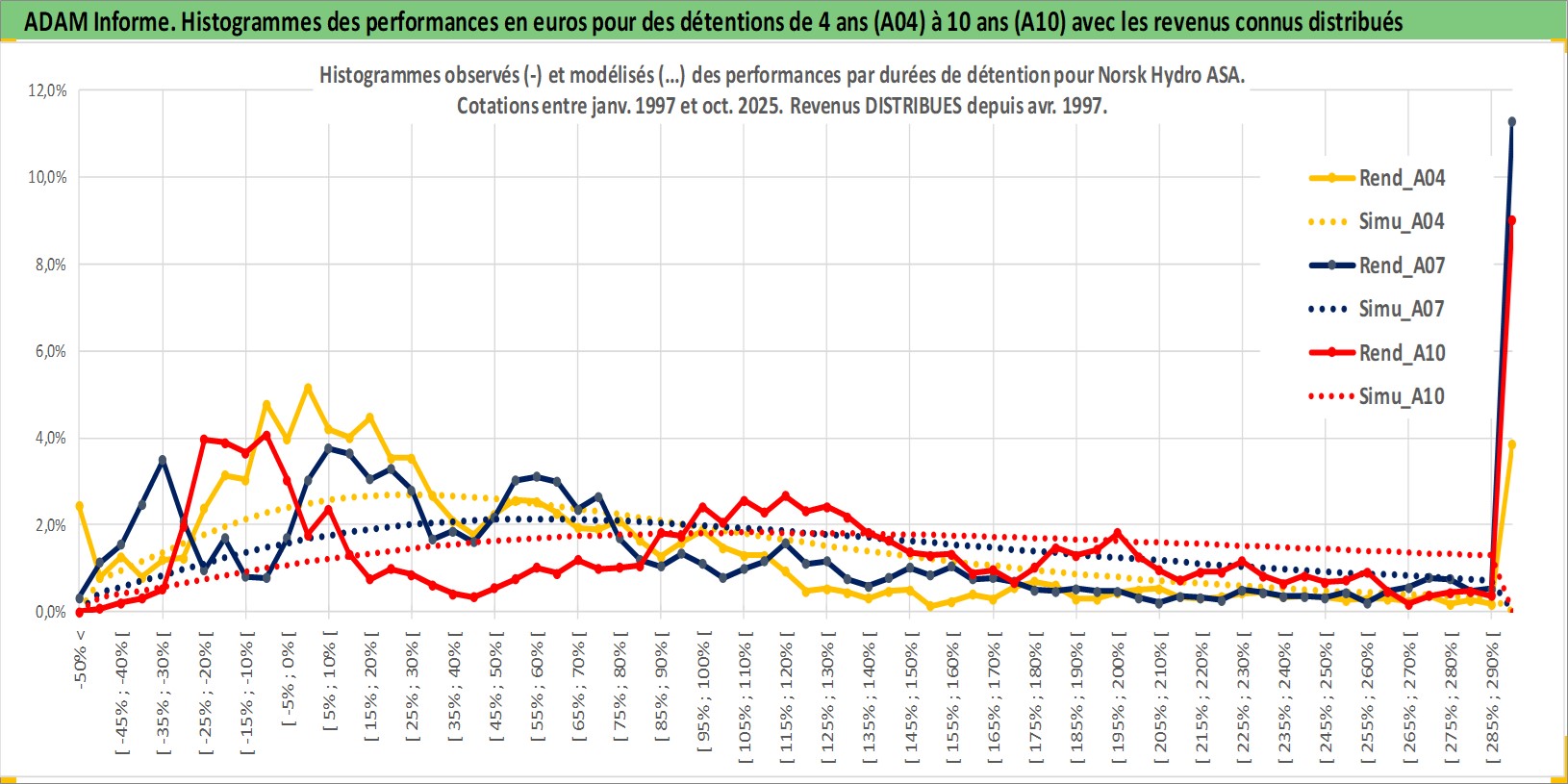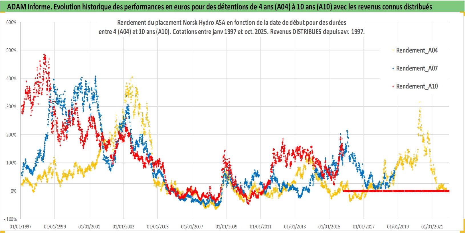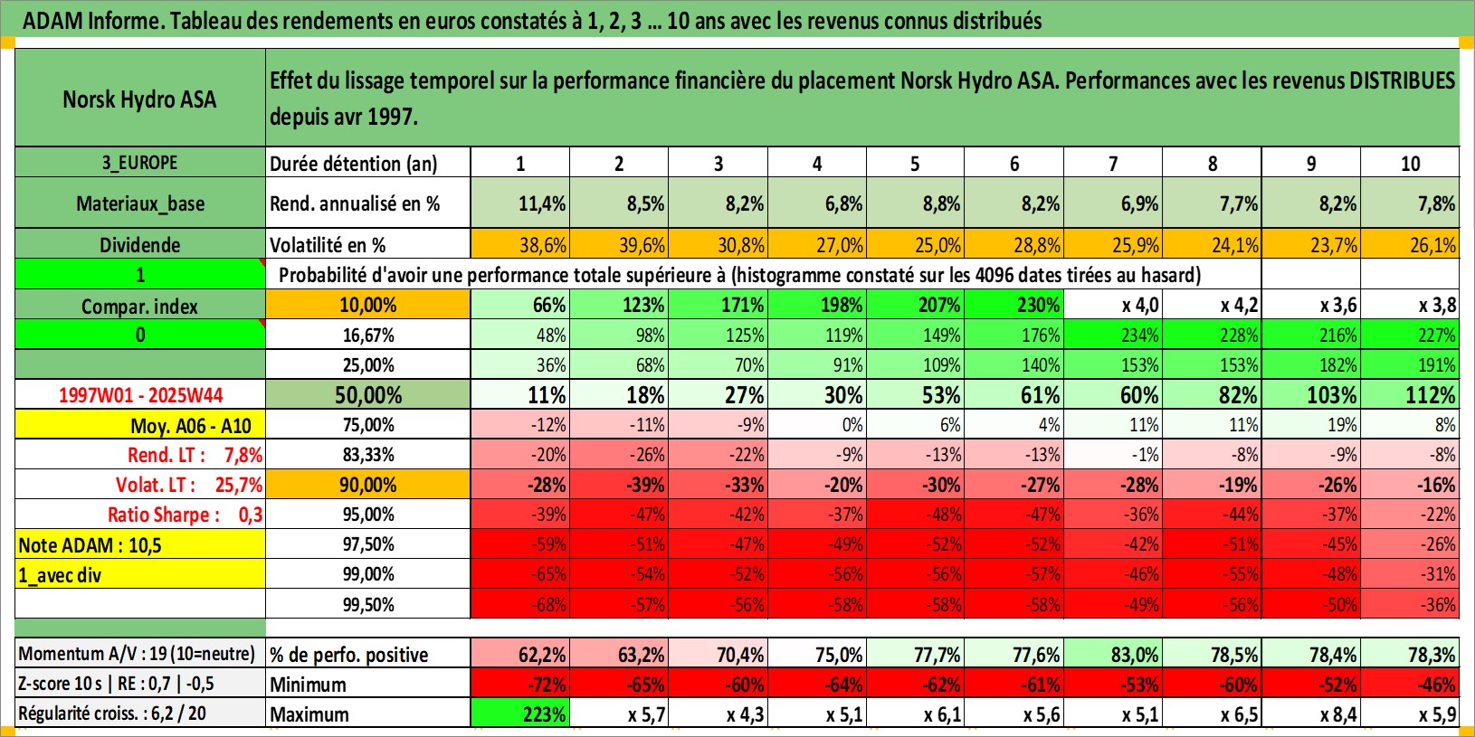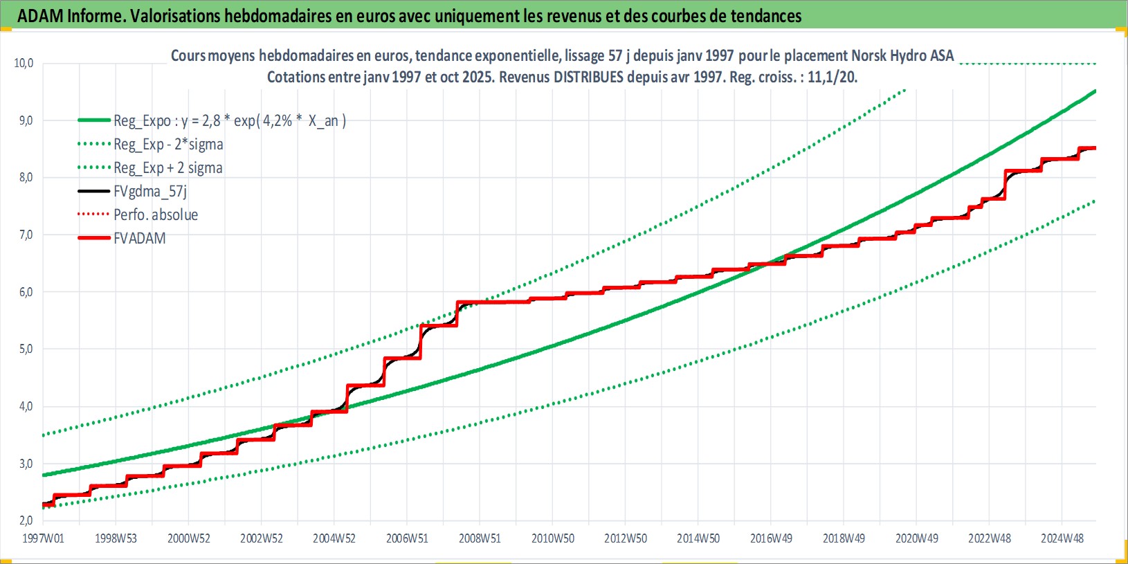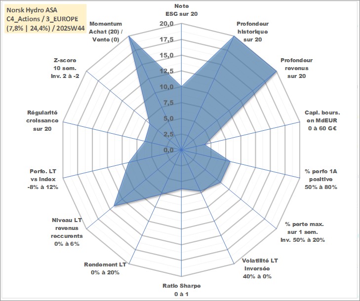 Site dédié aux investisseursPage dédiée sur site financeAnalyse des valorisations hebdomadaires de l'action Norsk Hydro ASA. Cet actif est cote en NOK. Les valorisations sont en contrevaleur EURO et couvrent les semaines 1997W01 a 2025W44. Les revenus de cet actif financier sont pris en compte depuis la semaine 1997W17. La note globale ESG de cet actif est estimee a 10.0 (apres rebasage entre 0 et 20).