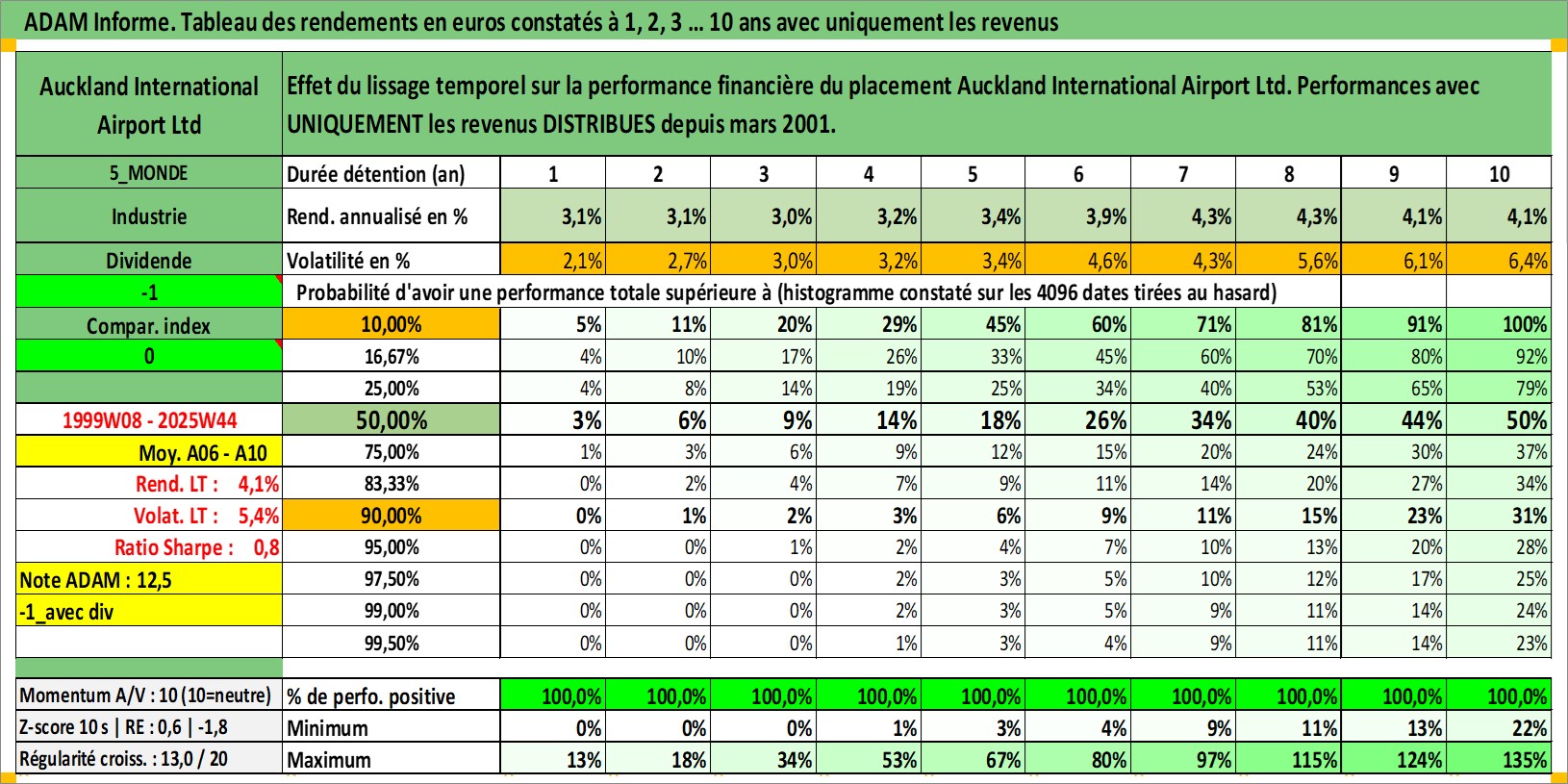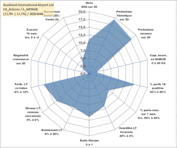 Site dédié aux investisseursPage dédiée sur site financeAnalyse des valorisations hebdomadaires de l'action Auckland International Airport Ltd. Cet actif est cote en AUD. Les valorisations sont en contrevaleur EURO et couvrent les semaines 1999W08 a 2025W44. Les revenus de cet actif financier sont pris en compte depuis la semaine 2001W11. La note globale ESG de cet actif est estimee a 11.0 (apres rebasage entre 0 et 20).