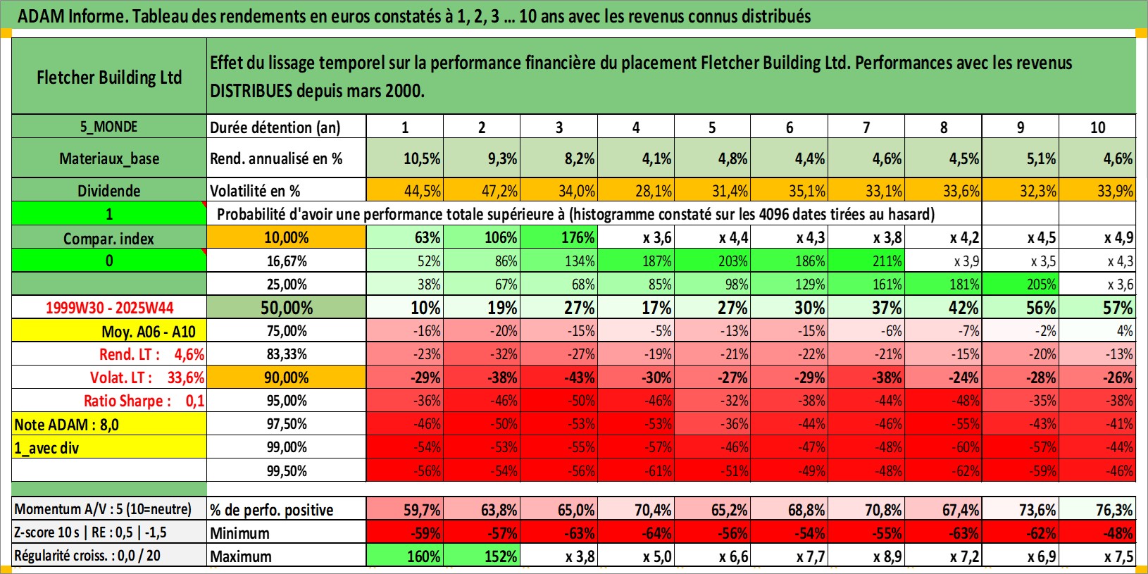 Site dédié aux investisseursPage dédiée sur site financeAnalyse des valorisations hebdomadaires de l'action Fletcher Building Ltd. Cet actif est cote en AUD. Les valorisations sont en contrevaleur EURO et couvrent les semaines 1999W30 a 2025W44. Les revenus de cet actif financier sont pris en compte depuis la semaine 2000W10. La note ESG de cet actif n'est pas connue.