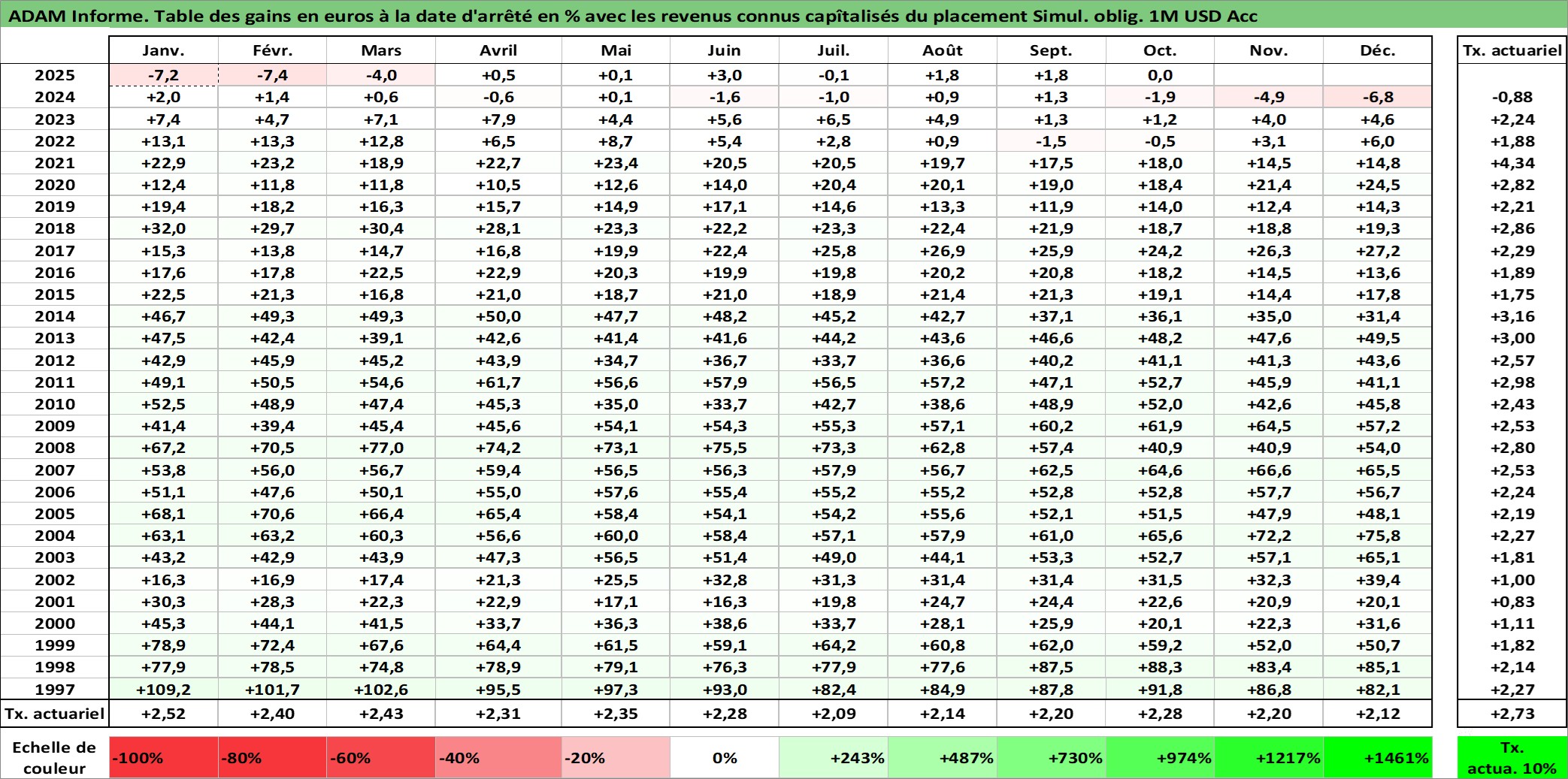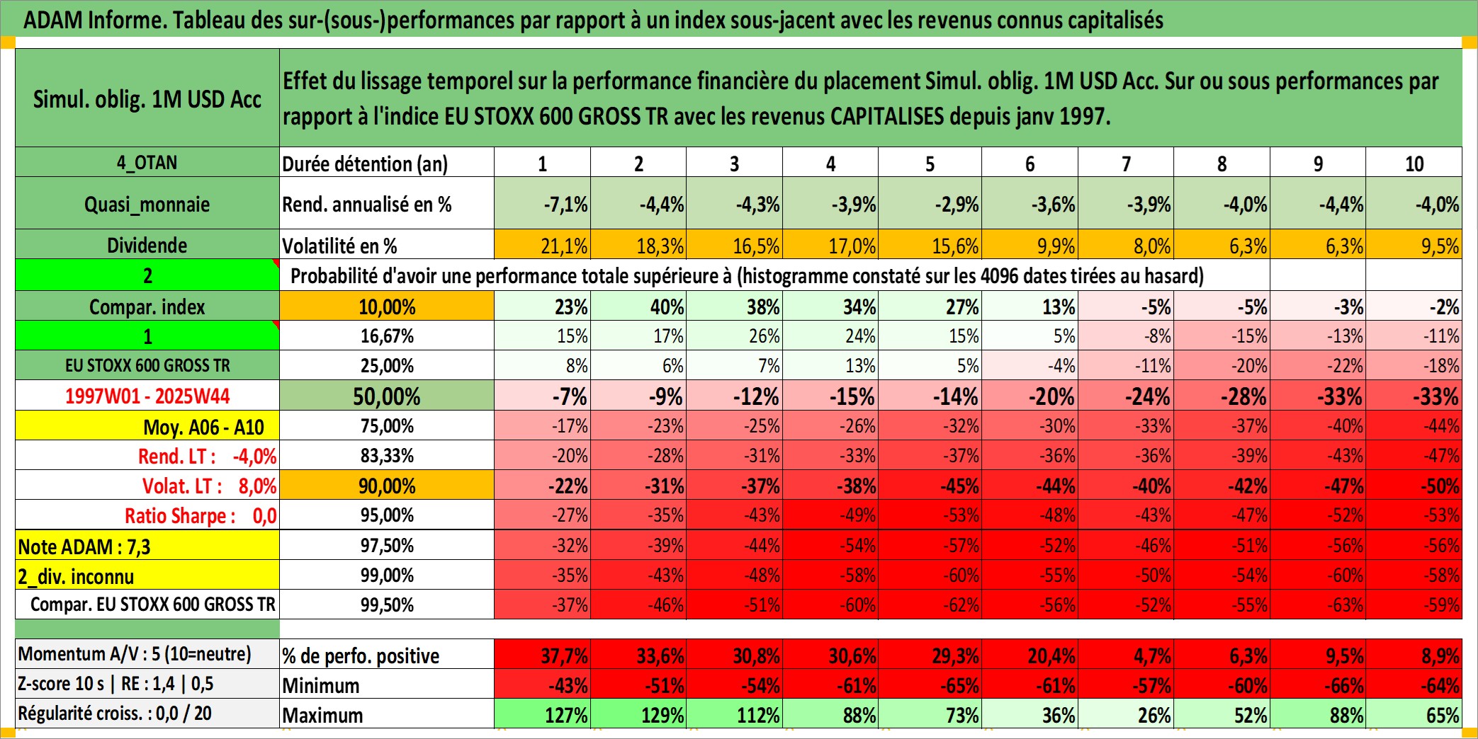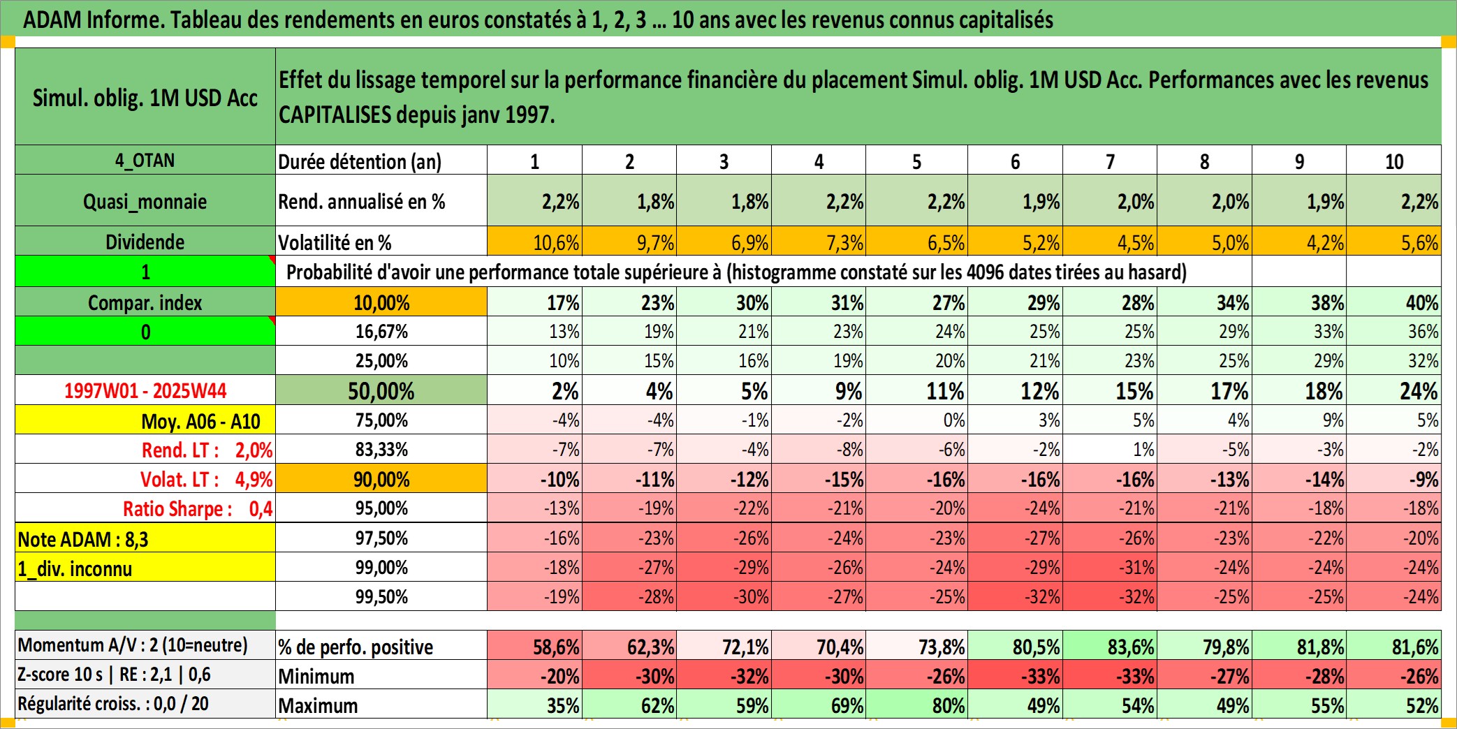 Site dédié aux investisseursPage dédiée sur site financeAnalyse des valorisations hebdomadaires de l'action Simul. oblig. 1M USD Acc. Cet actif est cote en USD. Les valorisations sont en contrevaleur EURO et couvrent les semaines 1997W01 a 2025W44. Les revenus de cet actif financier sont pris en compte depuis la semaine 1997W01. La note ESG de cet actif n'est pas connue.