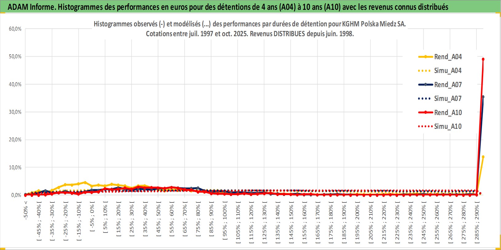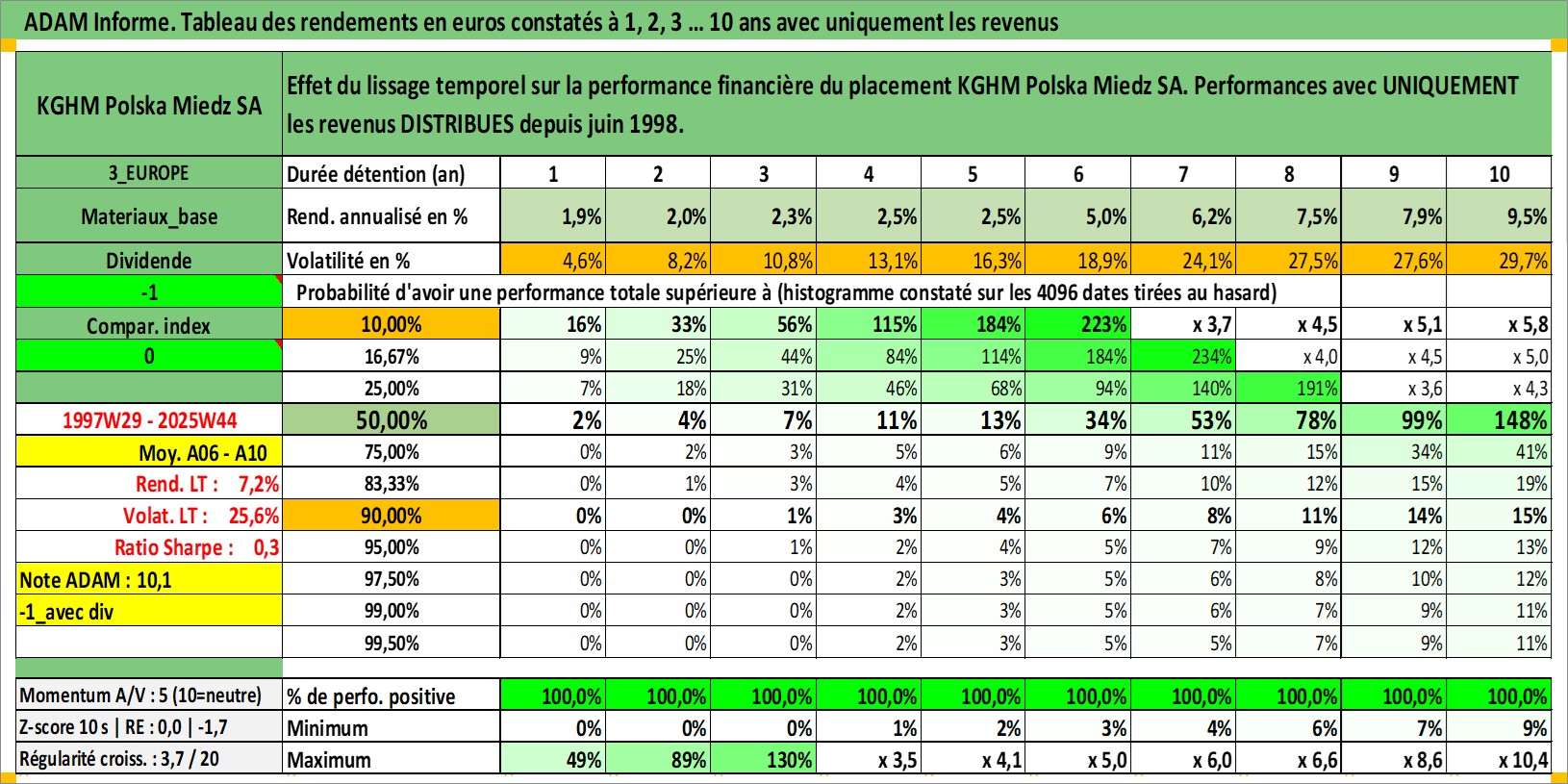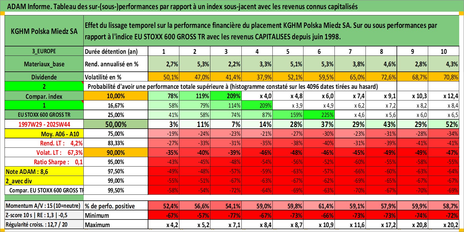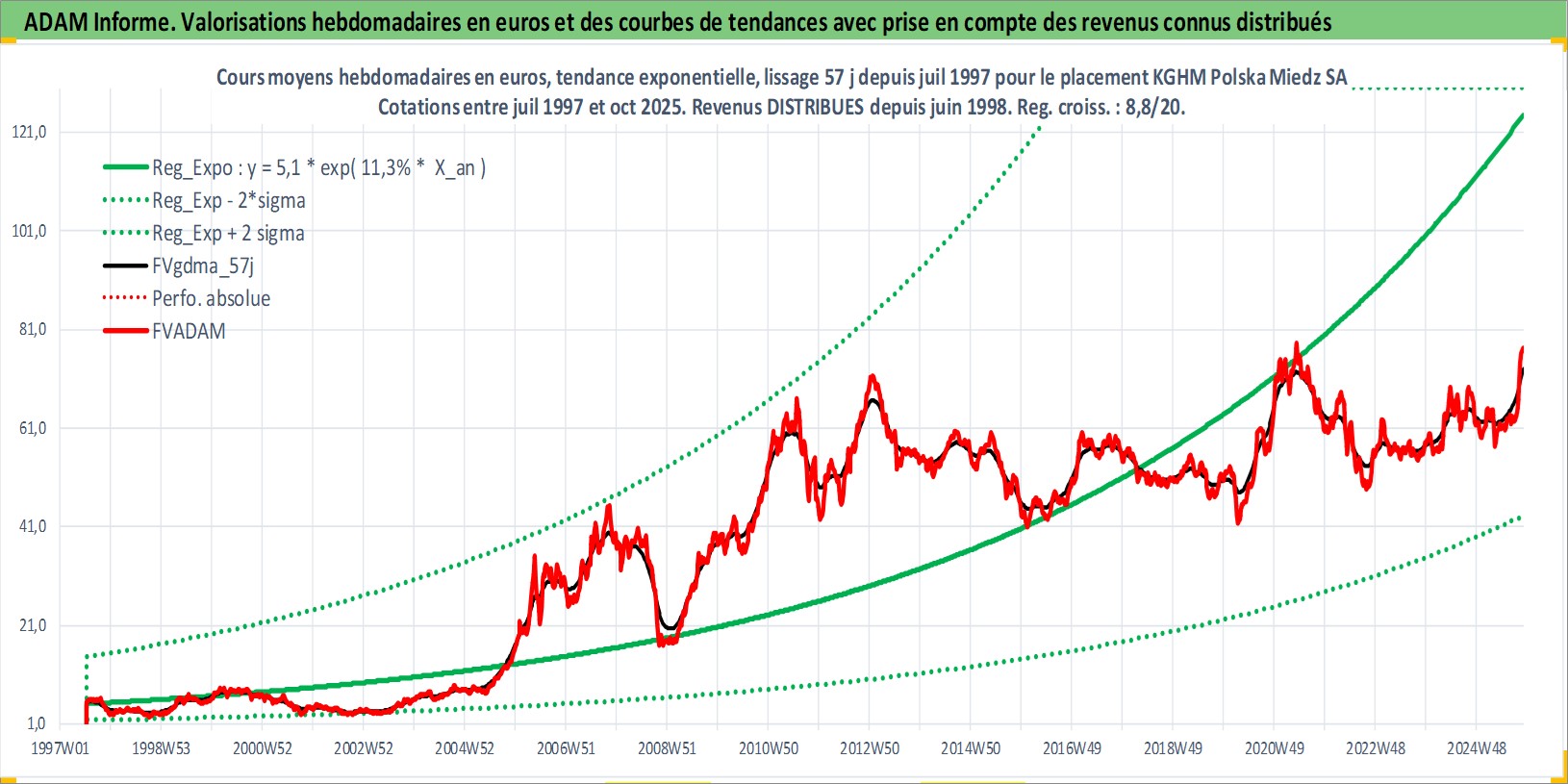 Site dédié aux investisseursPage dédiée sur site financeAnalyse des valorisations hebdomadaires de l'action KGHM Polska Miedz SA. Cet actif est cote en PLN. Les valorisations sont en contrevaleur EURO et couvrent les semaines 1997W29 a 2025W44. Les revenus de cet actif financier sont pris en compte depuis la semaine 1998W26. La note globale ESG de cet actif est estimee a 3.0 (apres rebasage entre 0 et 20).