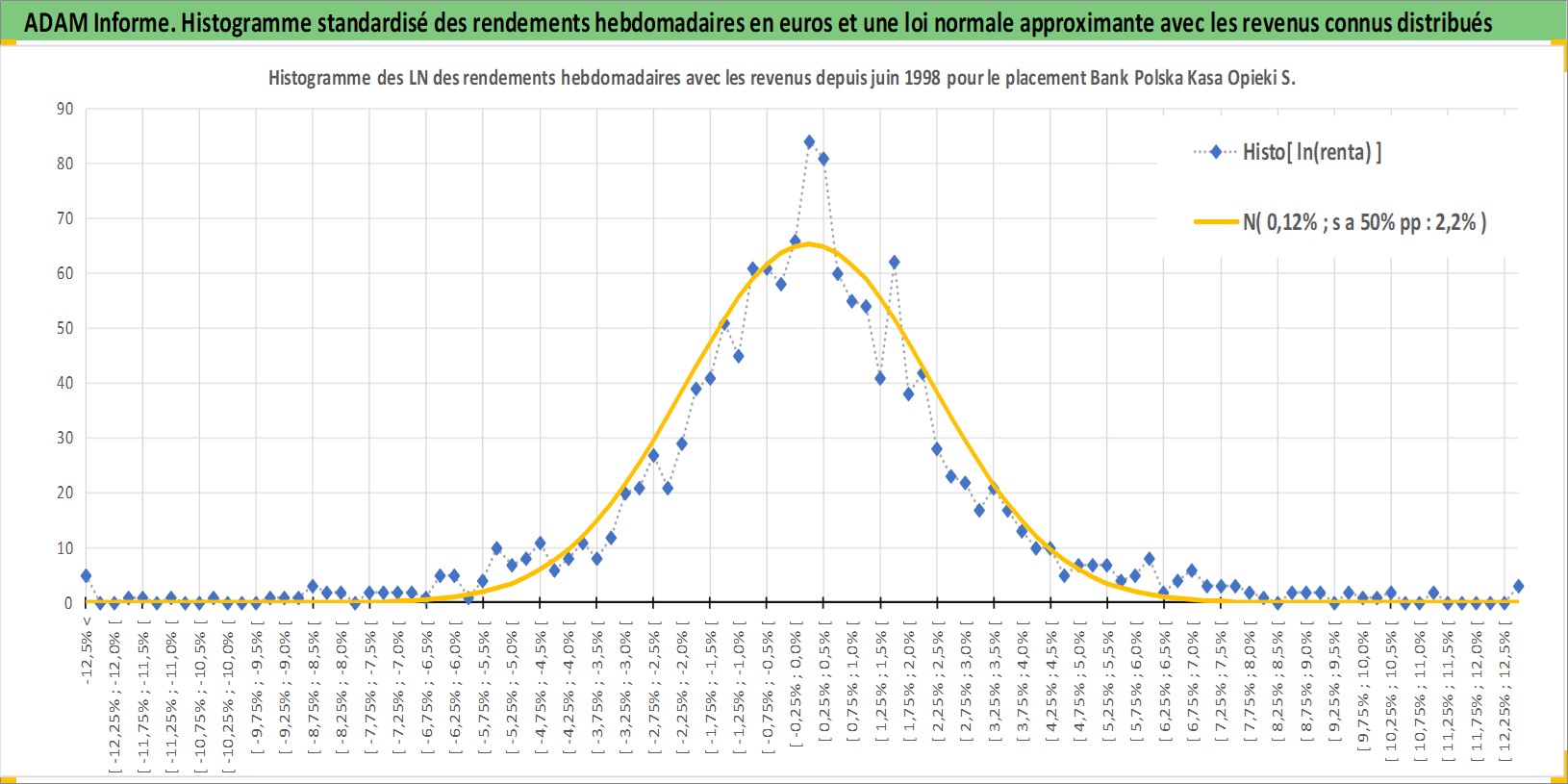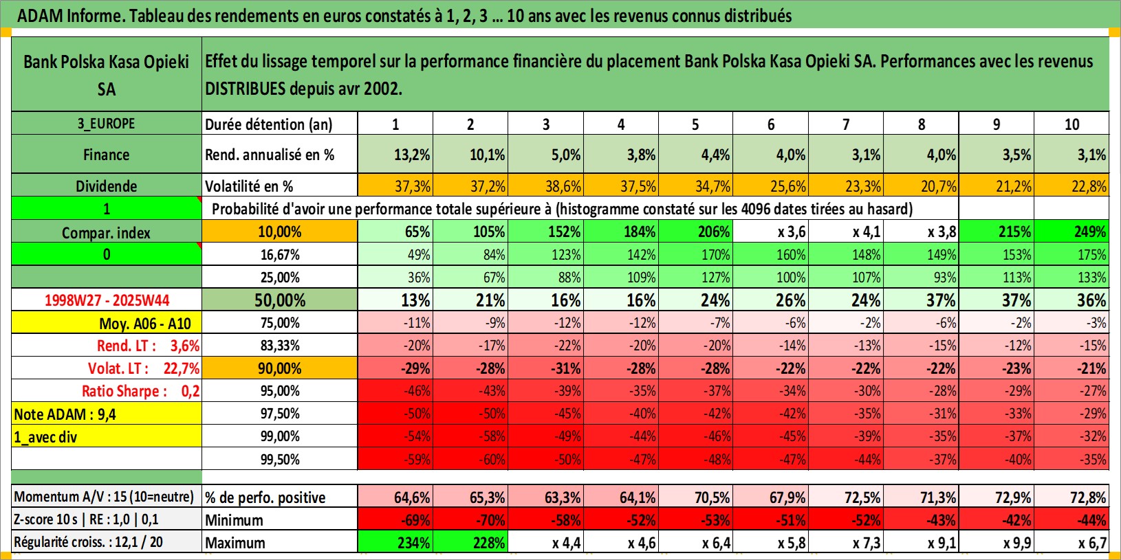 Site dédié aux investisseursPage dédiée sur site financeAnalyse des valorisations hebdomadaires de l'action Bank Polska Kasa Opieki SA. Cet actif est cote en PLN. Les valorisations sont en contrevaleur EURO et couvrent les semaines 1998W27 a 2025W44. Les revenus de cet actif financier sont pris en compte depuis la semaine 2002W15. La note globale ESG de cet actif est estimee a 7.0 (apres rebasage entre 0 et 20).
