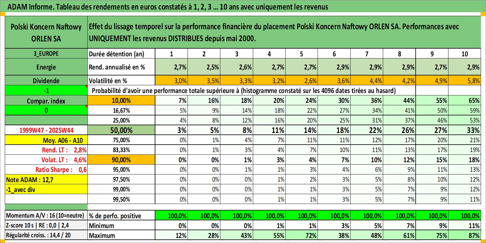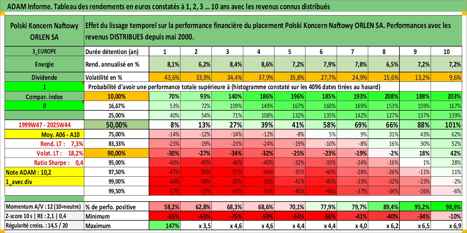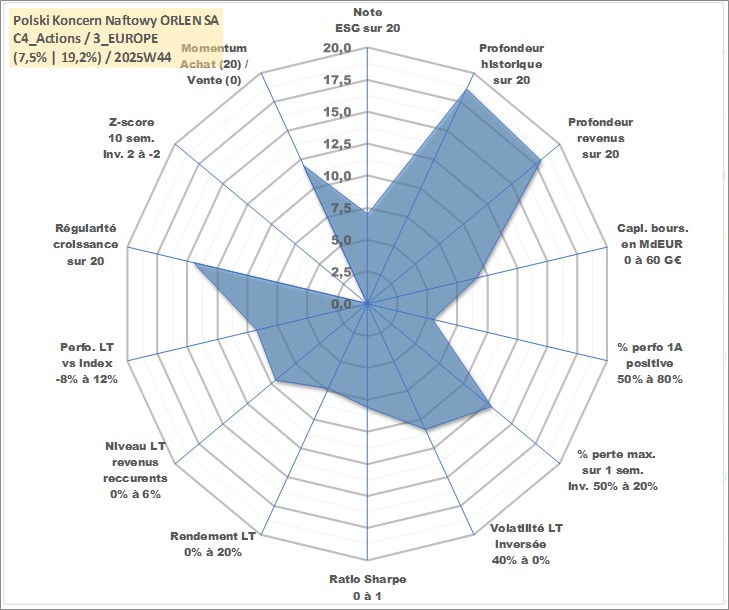 Site dédié aux investisseursPage dédiée sur site financeAnalyse des valorisations hebdomadaires de l'action Polski Koncern Naftowy ORLEN SA. Cet actif est cote en PLN. Les valorisations sont en contrevaleur EURO et couvrent les semaines 1999W47 a 2025W44. Les revenus de cet actif financier sont pris en compte depuis la semaine 2000W22. La note globale ESG de cet actif est estimee a 7.0 (apres rebasage entre 0 et 20).