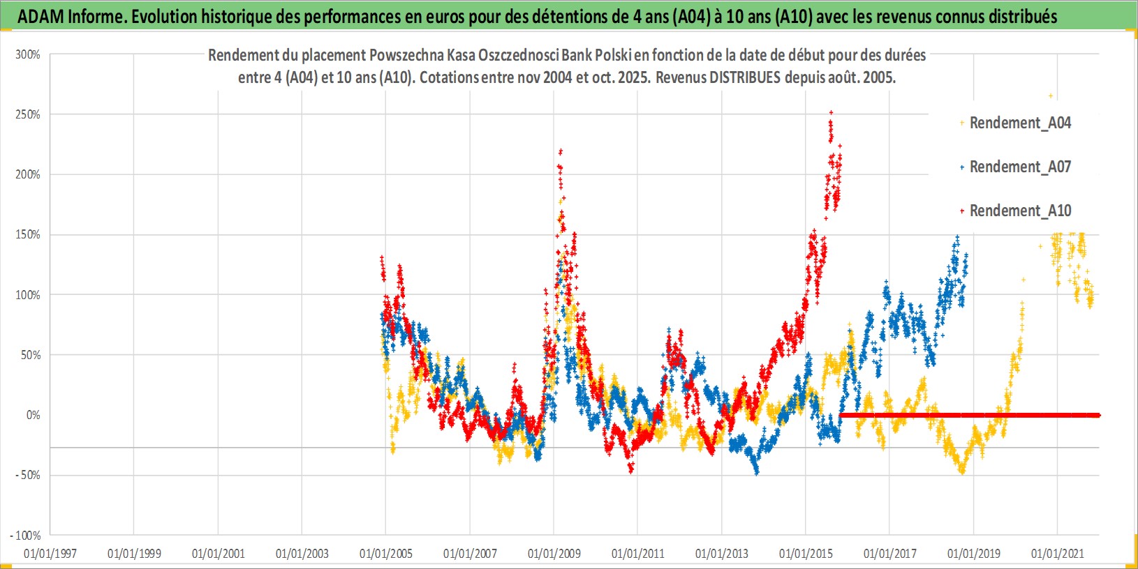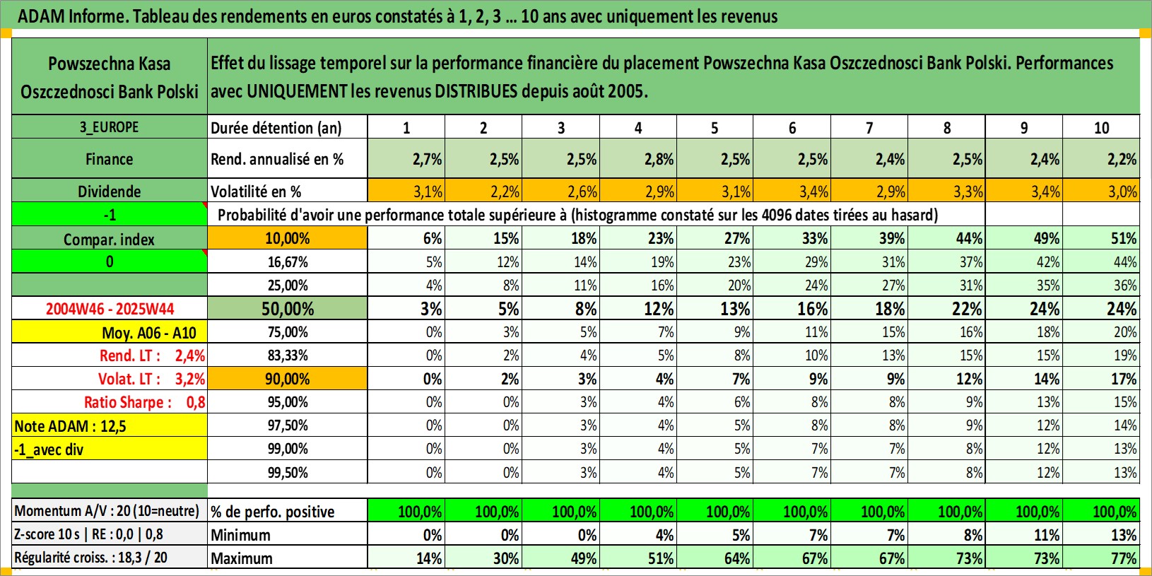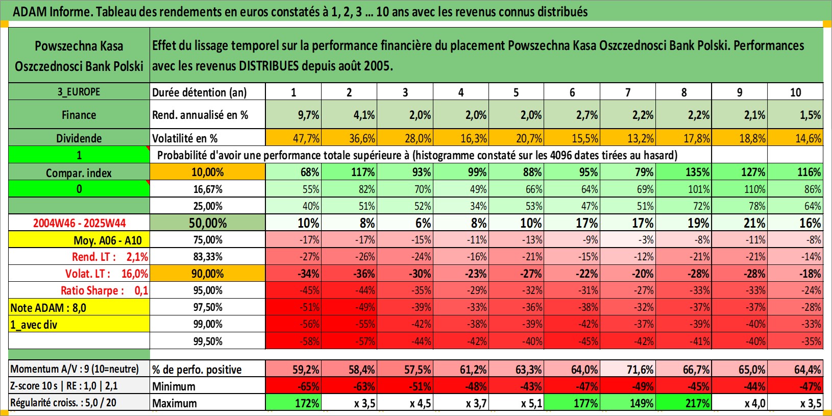 Site dédié aux investisseursPage dédiée sur site financeAnalyse des valorisations hebdomadaires de l'action Powszechna Kasa Oszczednosci Bank Polski. Cet actif est cote en PLN. Les valorisations sont en contrevaleur EURO et couvrent les semaines 2004W46 a 2025W44. Les revenus de cet actif financier sont pris en compte depuis la semaine 2005W33. La note globale ESG de cet actif est estimee a 10.0 (apres rebasage entre 0 et 20).