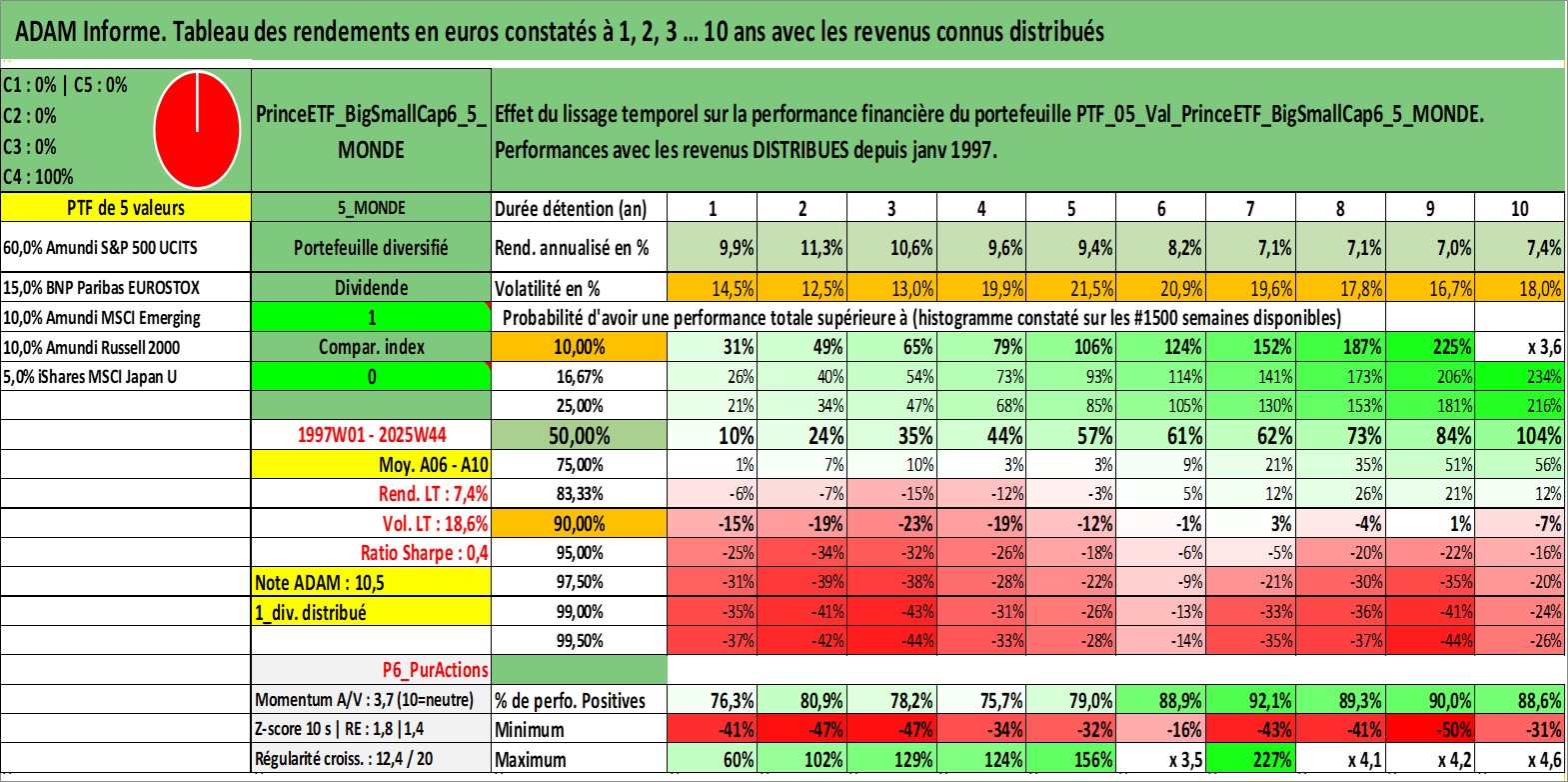 Site dédié aux investisseursPage dédiée sur site financeAnalyse des valorisations hebdomadaires du portefeuille PrinceETF_BigSmallCap6_5_MONDE_5actifs avec un profil P6_PurActions. Ce portefeuille est cote en EUR. Les valorisations couvrent les semaines 1997W01 a 2025W44. Les revenus de cet actif financier sont pris en compte depuis la semaine 1997W01. La note ESG de cet actif n'est pas connue.