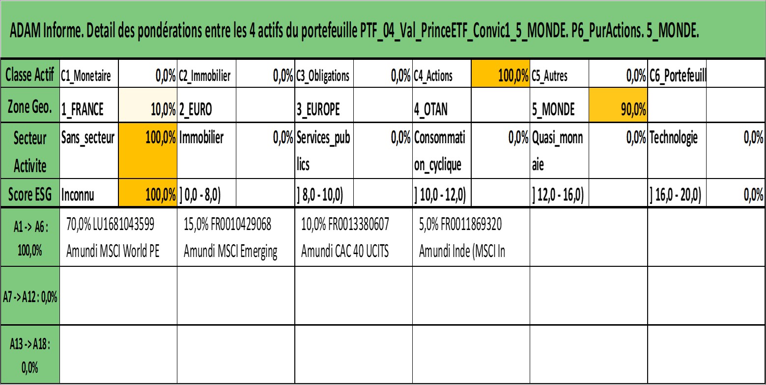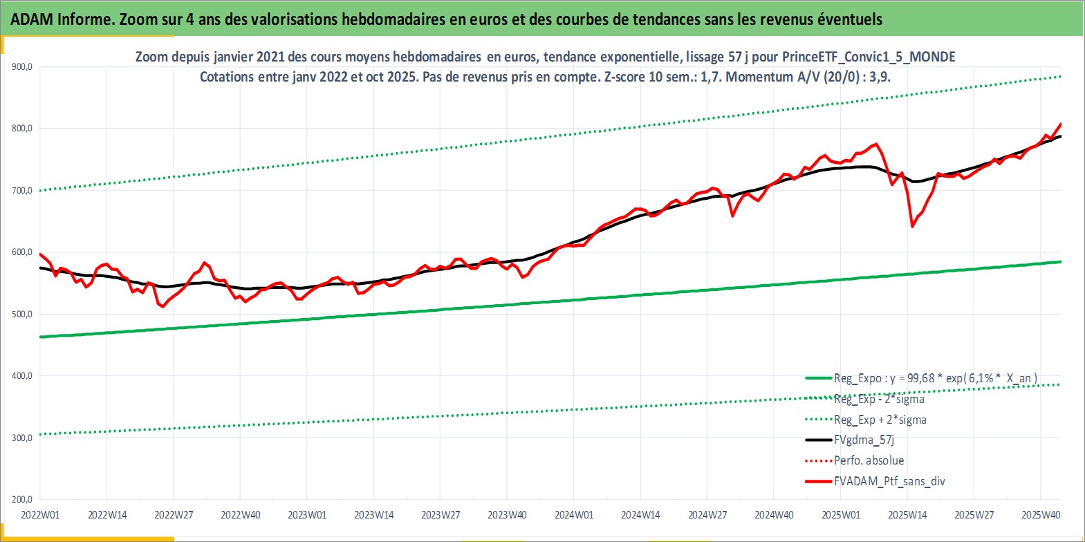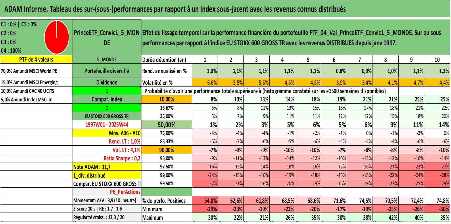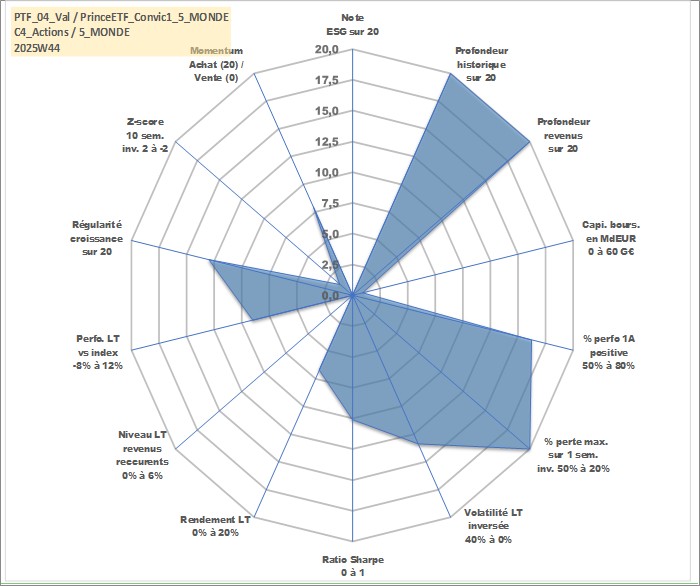 Site dédié aux investisseursPage dédiée sur site financeAnalyse des valorisations hebdomadaires du portefeuille PrinceETF_Convic1_5_MONDE_4actifs avec un profil P6_PurActions. Ce portefeuille est cote en EUR. Les valorisations couvrent les semaines 1997W01 a 2025W44. Les revenus de cet actif financier sont pris en compte depuis la semaine 1997W01. La note ESG de cet actif n'est pas connue.