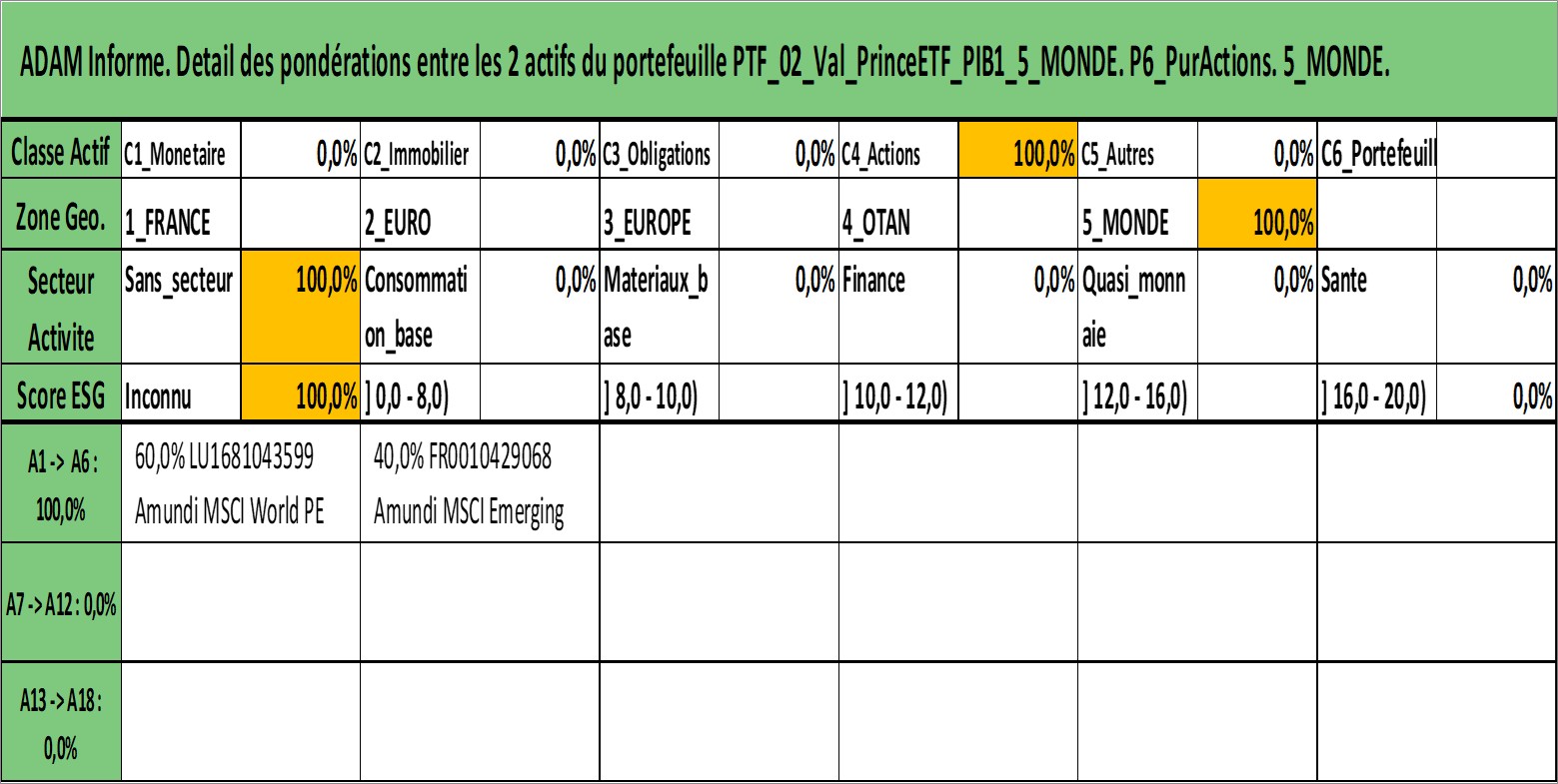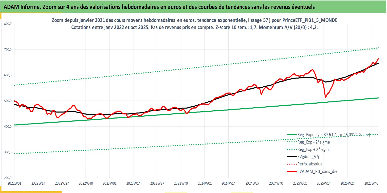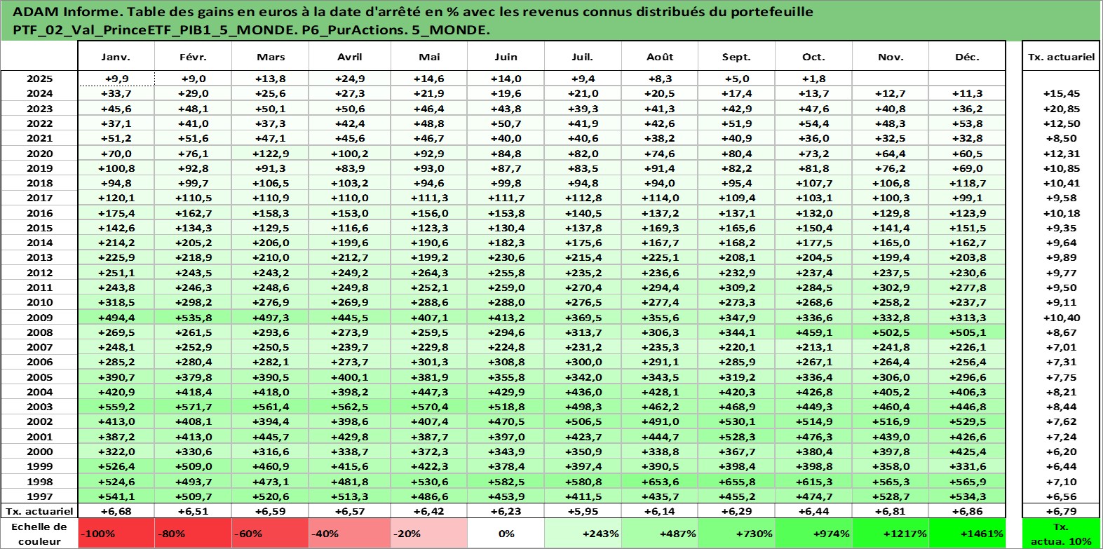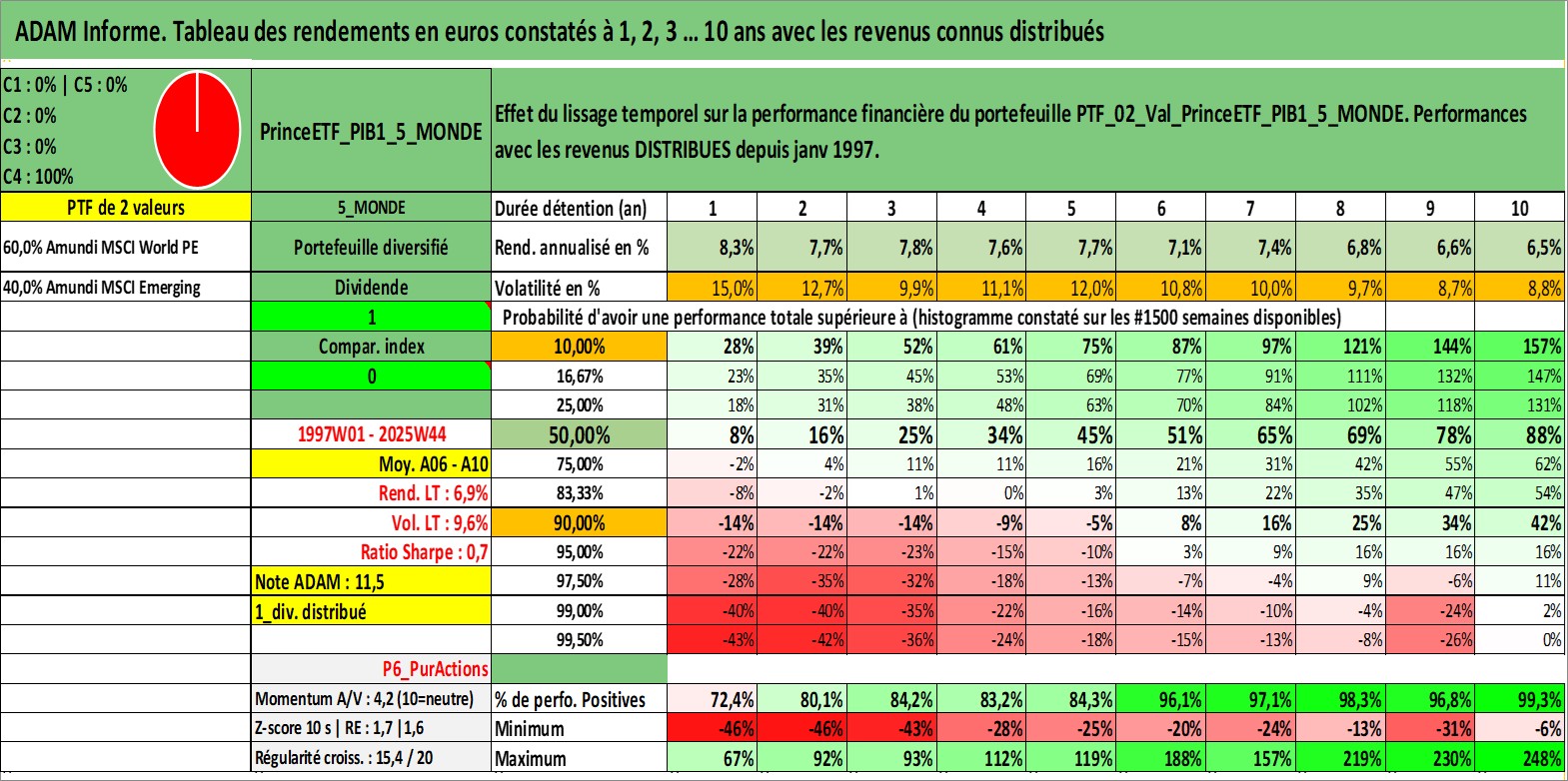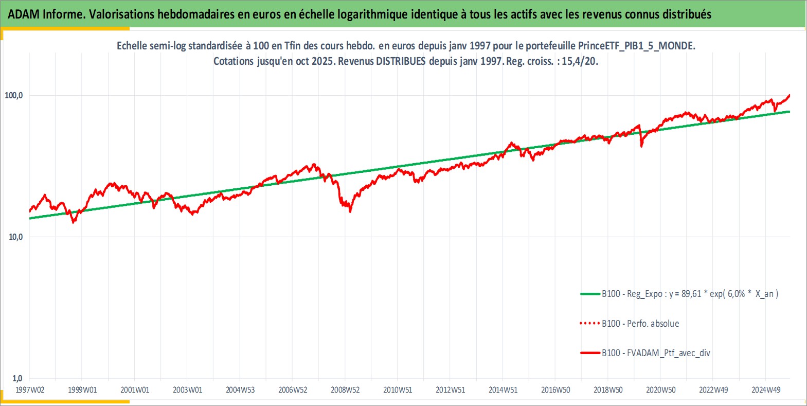 Site dédié aux investisseursPage dédiée sur site financeAnalyse des valorisations hebdomadaires du portefeuille PrinceETF_PIB1_5_MONDE_2actifs avec un profil P6_PurActions. Ce portefeuille est cote en EUR. Les valorisations couvrent les semaines 1997W01 a 2025W44. Les revenus de cet actif financier sont pris en compte depuis la semaine 1997W01. La note ESG de cet actif n'est pas connue.