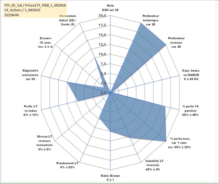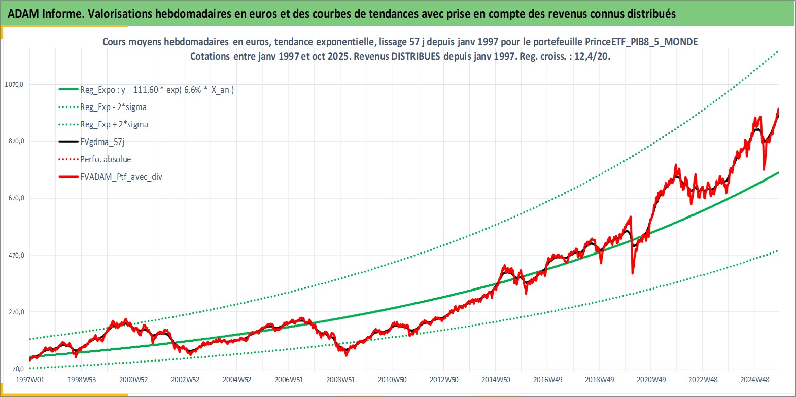 Site dédié aux investisseursPage dédiée sur site financeAnalyse des valorisations hebdomadaires du portefeuille PrinceETF_PIB8_5_MONDE_5actifs avec un profil P6_PurActions. Ce portefeuille est cote en EUR. Les valorisations couvrent les semaines 1997W01 a 2025W44. Les revenus de cet actif financier sont pris en compte depuis la semaine 1997W01. La note ESG de cet actif n'est pas connue.