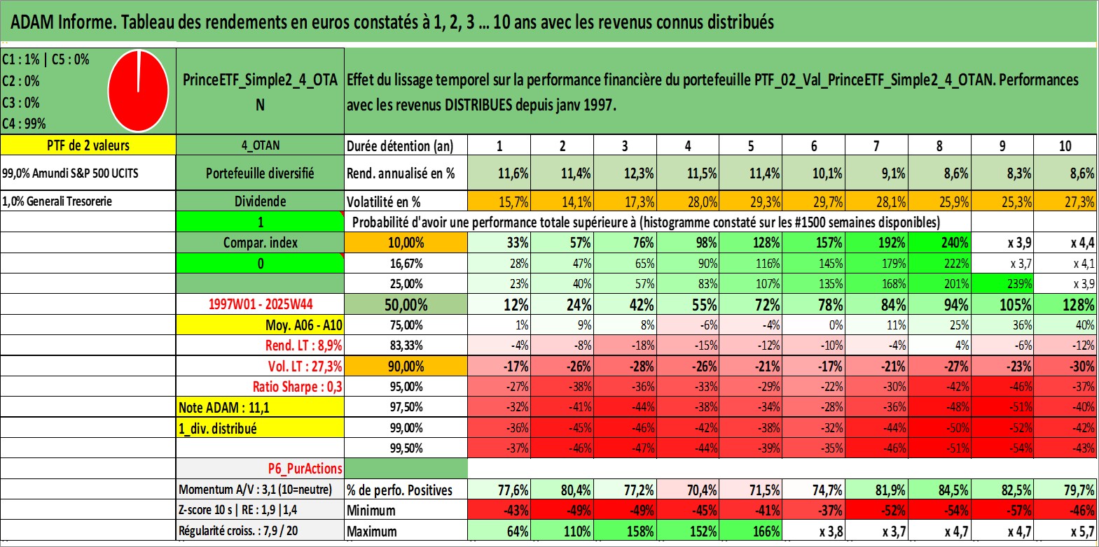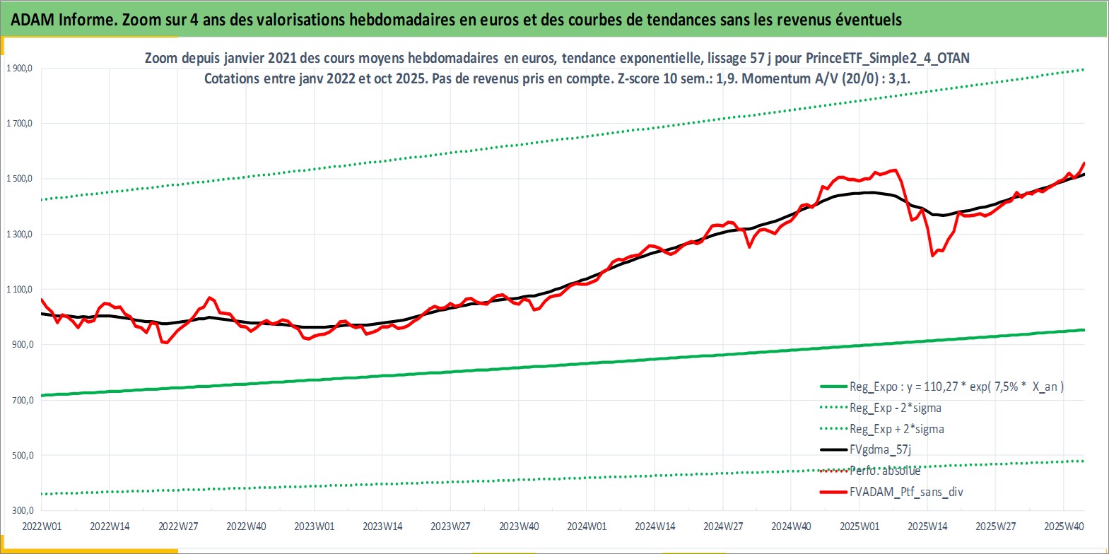 Site dédié aux investisseursPage dédiée sur site financeAnalyse des valorisations hebdomadaires du portefeuille PrinceETF_Simple2_4_OTAN_2actifs avec un profil P6_PurActions. Ce portefeuille est cote en EUR. Les valorisations couvrent les semaines 1997W01 a 2025W44. Les revenus de cet actif financier sont pris en compte depuis la semaine 1997W01. La note ESG de cet actif n'est pas connue.