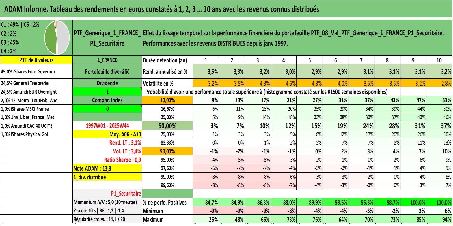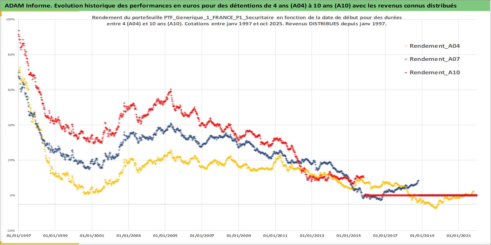 Site dédié aux investisseursPage dédiée sur site financeAnalyse des valorisations hebdomadaires du portefeuille PTF_Generique_1_FRANCE_P1_Securitaire_8actifs avec un profil P1_Securitaire. Ce portefeuille est cote en EUR. Les valorisations couvrent les semaines 1997W01 a 2025W44. Les revenus de cet actif financier sont pris en compte depuis la semaine 1997W01. La note ESG de cet actif n'est pas connue.