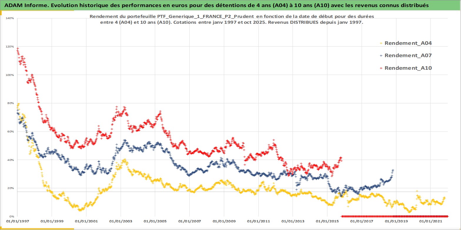 Site dédié aux investisseursPage dédiée sur site financeAnalyse des valorisations hebdomadaires du portefeuille PTF_Generique_1_FRANCE_P2_Prudent_8actifs avec un profil P2_Prudent. Ce portefeuille est cote en EUR. Les valorisations couvrent les semaines 1997W01 a 2025W44. Les revenus de cet actif financier sont pris en compte depuis la semaine 1997W01. La note ESG de cet actif n'est pas connue.