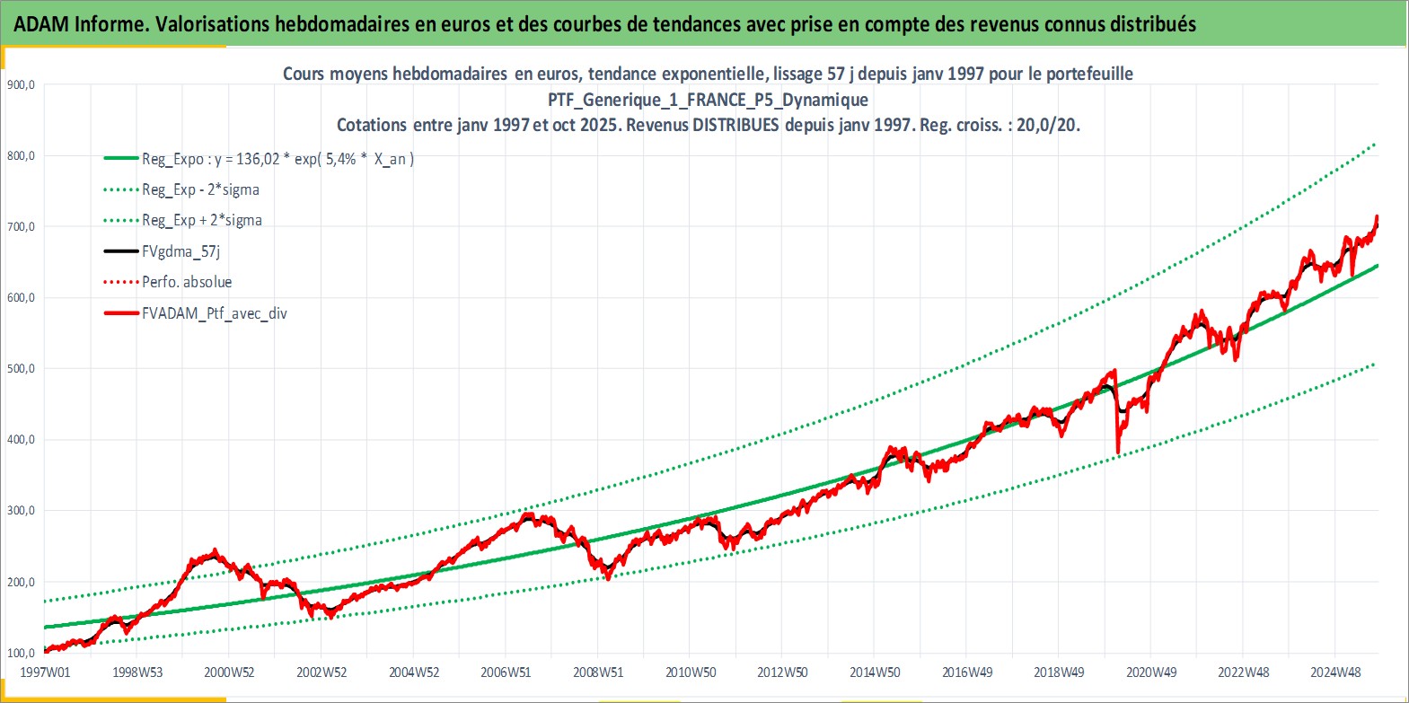 Site dédié aux investisseursPage dédiée sur site financeAnalyse des valorisations hebdomadaires du portefeuille PTF_Generique_1_FRANCE_P5_Dynamique_8actifs avec un profil P5_Dynamique. Ce portefeuille est cote en EUR. Les valorisations couvrent les semaines 1997W01 a 2025W44. Les revenus de cet actif financier sont pris en compte depuis la semaine 1997W01. La note ESG de cet actif n'est pas connue.