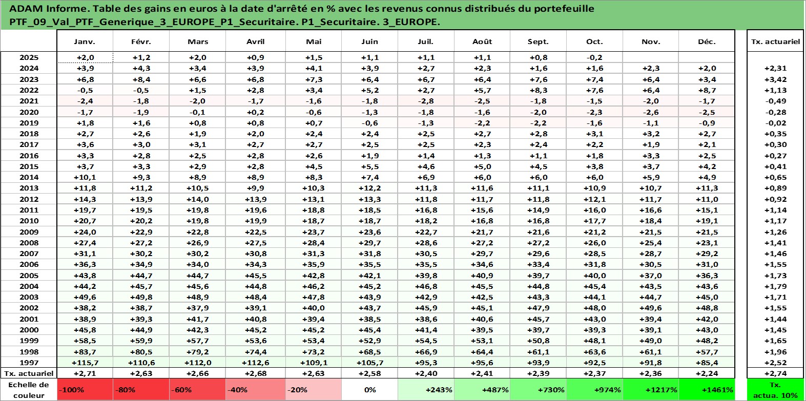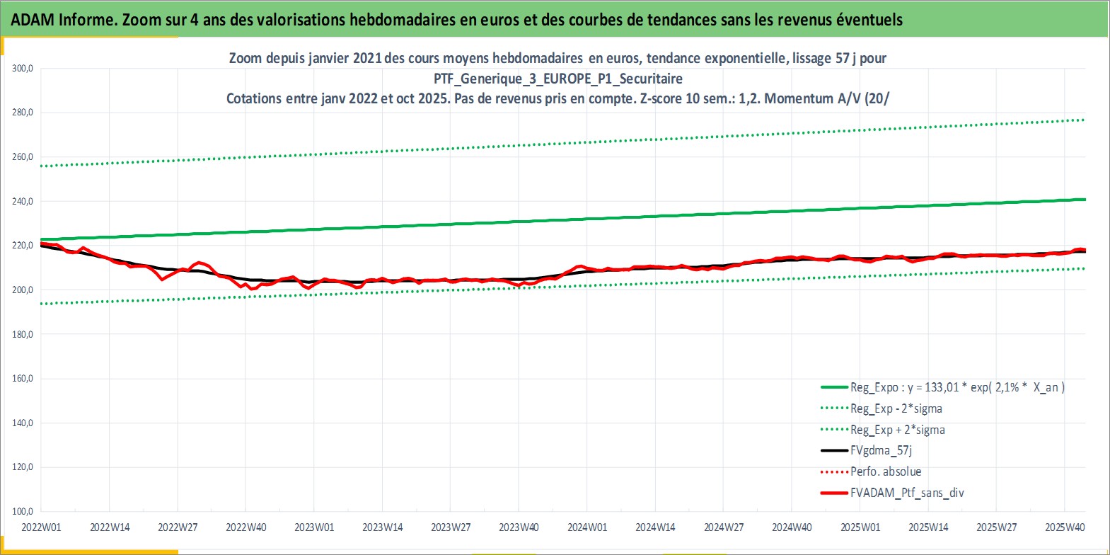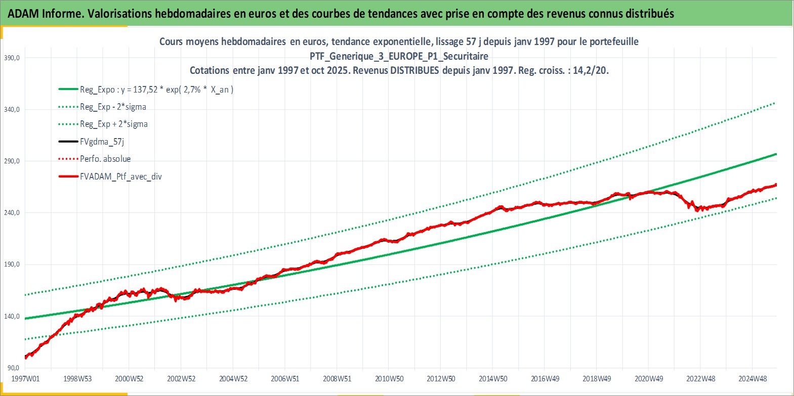 Site dédié aux investisseursPage dédiée sur site financeAnalyse des valorisations hebdomadaires du portefeuille PTF_Generique_3_EUROPE_P1_Securitaire_9actifs avec un profil P1_Securitaire. Ce portefeuille est cote en EUR. Les valorisations couvrent les semaines 1997W01 a 2025W44. Les revenus de cet actif financier sont pris en compte depuis la semaine 1997W01. La note ESG de cet actif n'est pas connue.