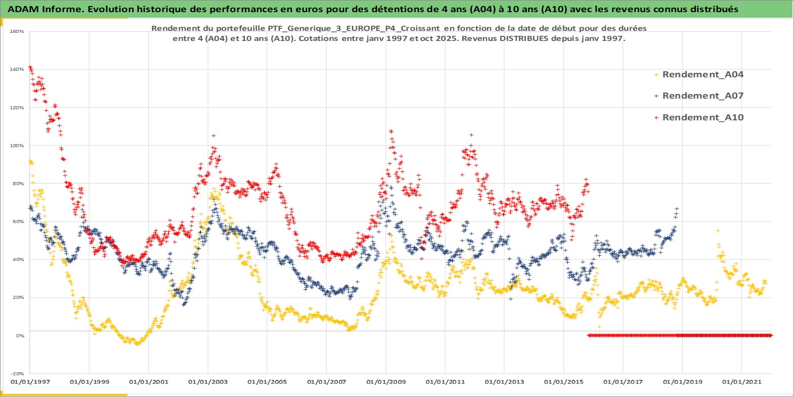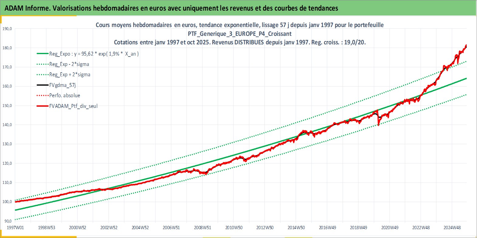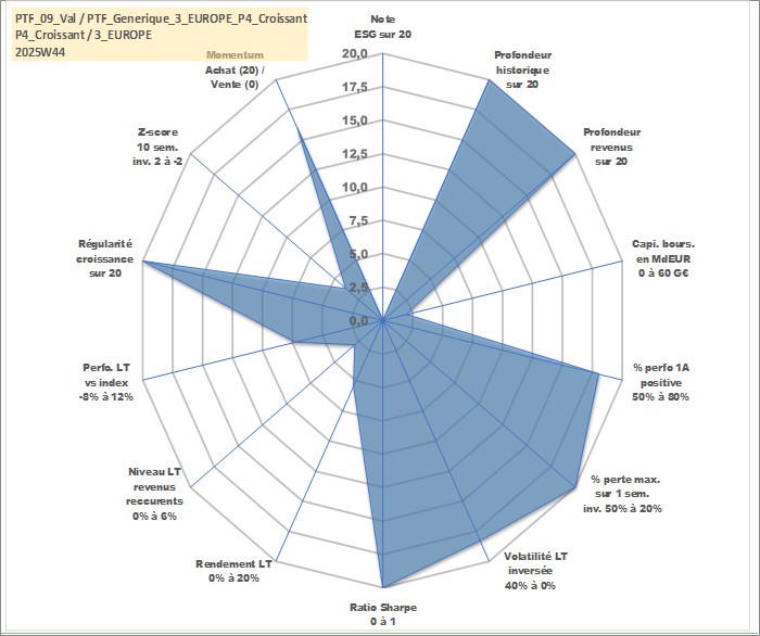 Site dédié aux investisseursPage dédiée sur site financeAnalyse des valorisations hebdomadaires du portefeuille PTF_Generique_3_EUROPE_P4_Croissant_9actifs avec un profil P4_Croissant. Ce portefeuille est cote en EUR. Les valorisations couvrent les semaines 1997W01 a 2025W44. Les revenus de cet actif financier sont pris en compte depuis la semaine 1997W01. La note ESG de cet actif n'est pas connue.