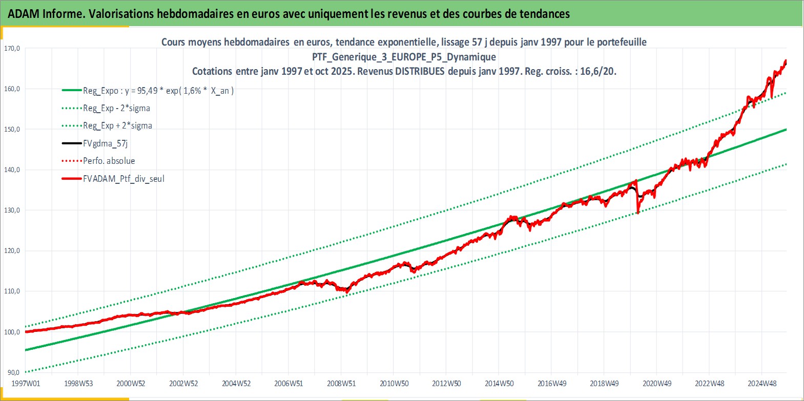 Site dédié aux investisseursPage dédiée sur site financeAnalyse des valorisations hebdomadaires du portefeuille PTF_Generique_3_EUROPE_P5_Dynamique_9actifs avec un profil P5_Dynamique. Ce portefeuille est cote en EUR. Les valorisations couvrent les semaines 1997W01 a 2025W44. Les revenus de cet actif financier sont pris en compte depuis la semaine 1997W01. La note ESG de cet actif n'est pas connue.