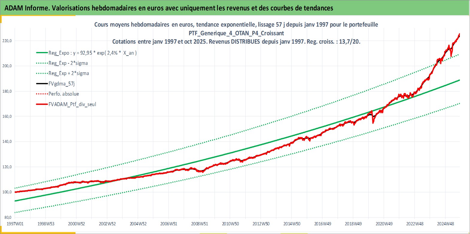 Site dédié aux investisseursPage dédiée sur site financeAnalyse des valorisations hebdomadaires du portefeuille PTF_Generique_4_OTAN_P4_Croissant_12actifs avec un profil P4_Croissant. Ce portefeuille est cote en EUR. Les valorisations couvrent les semaines 1997W01 a 2025W44. Les revenus de cet actif financier sont pris en compte depuis la semaine 1997W01. La note ESG de cet actif n'est pas connue.