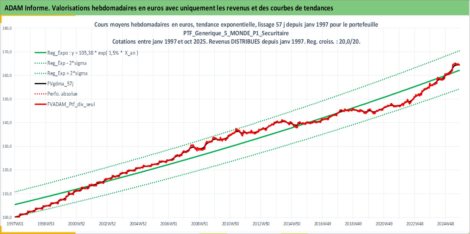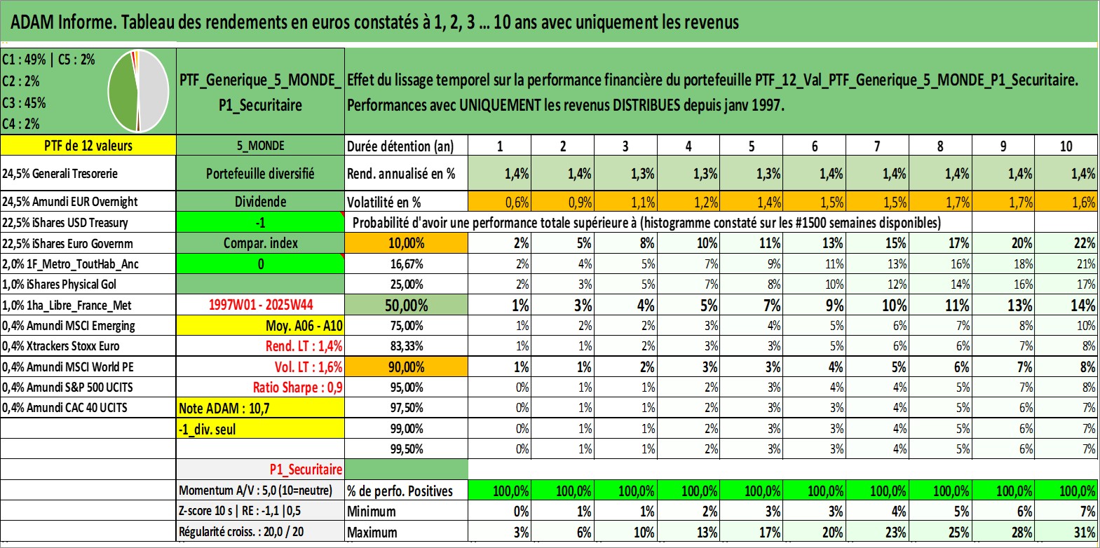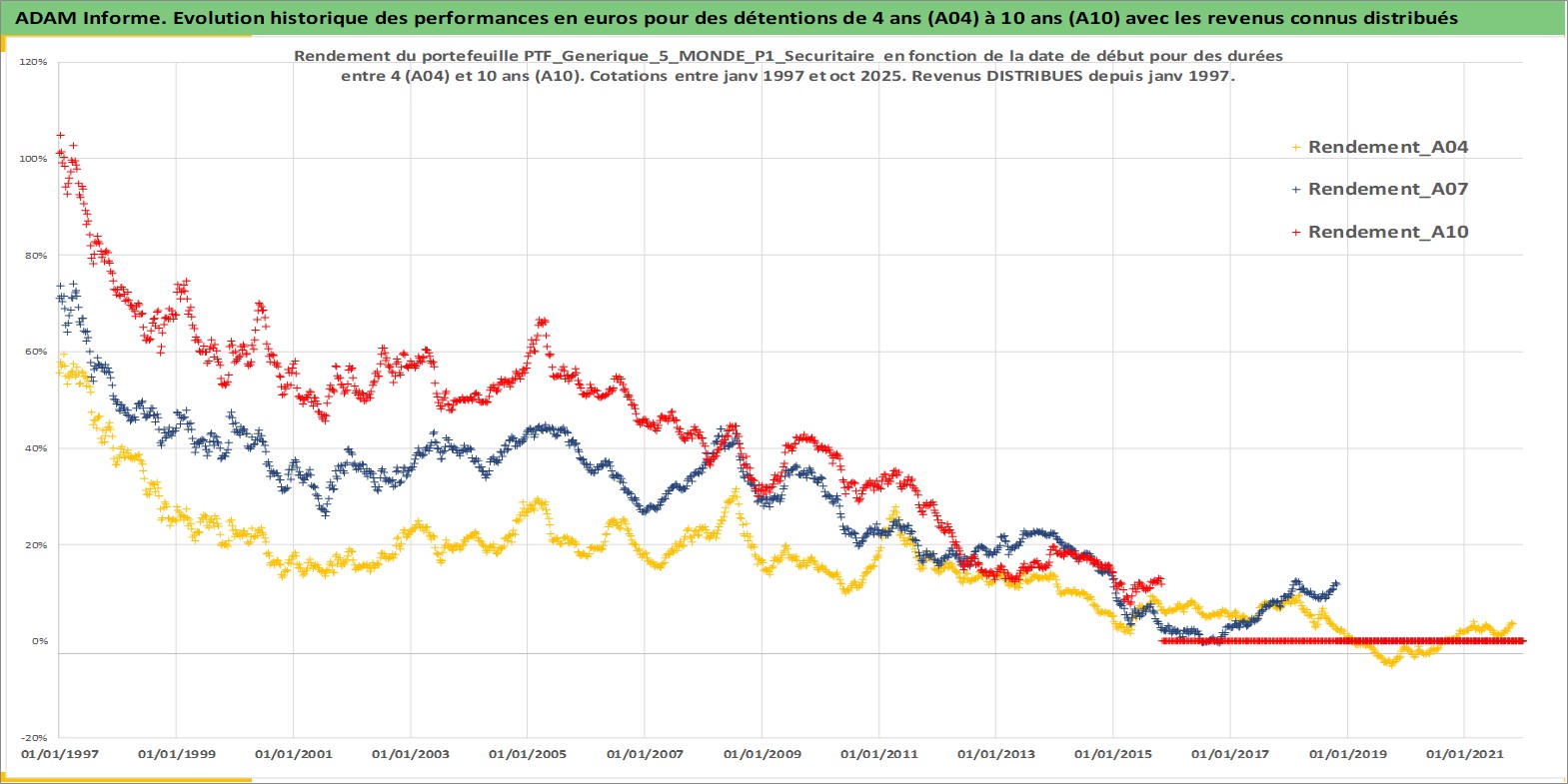 Site dédié aux investisseursPage dédiée sur site financeAnalyse des valorisations hebdomadaires du portefeuille PTF_Generique_5_MONDE_P1_Securitaire_12actifs avec un profil P1_Securitaire. Ce portefeuille est cote en EUR. Les valorisations couvrent les semaines 1997W01 a 2025W44. Les revenus de cet actif financier sont pris en compte depuis la semaine 1997W01. La note ESG de cet actif n'est pas connue.