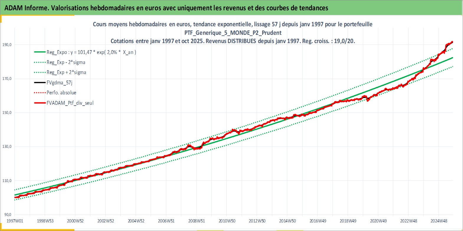 Site dédié aux investisseursPage dédiée sur site financeAnalyse des valorisations hebdomadaires du portefeuille PTF_Generique_5_MONDE_P2_Prudent_12actifs avec un profil P2_Prudent. Ce portefeuille est cote en EUR. Les valorisations couvrent les semaines 1997W01 a 2025W44. Les revenus de cet actif financier sont pris en compte depuis la semaine 1997W01. La note ESG de cet actif n'est pas connue.