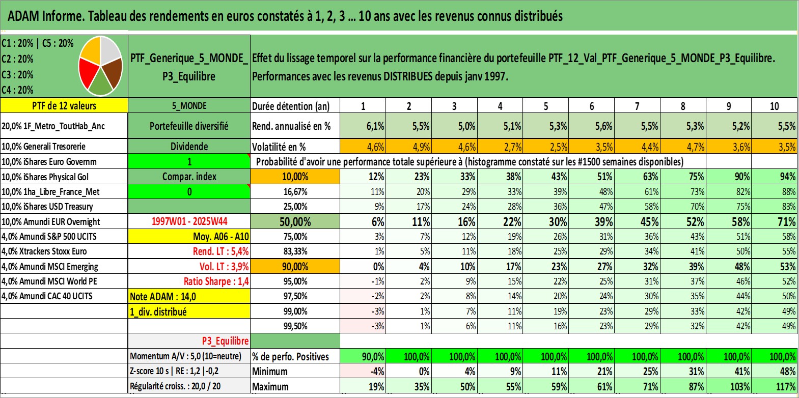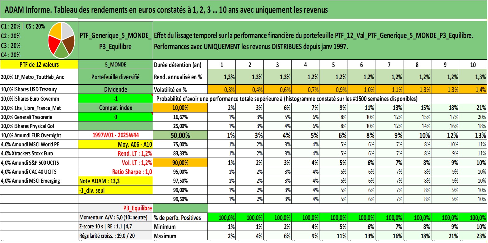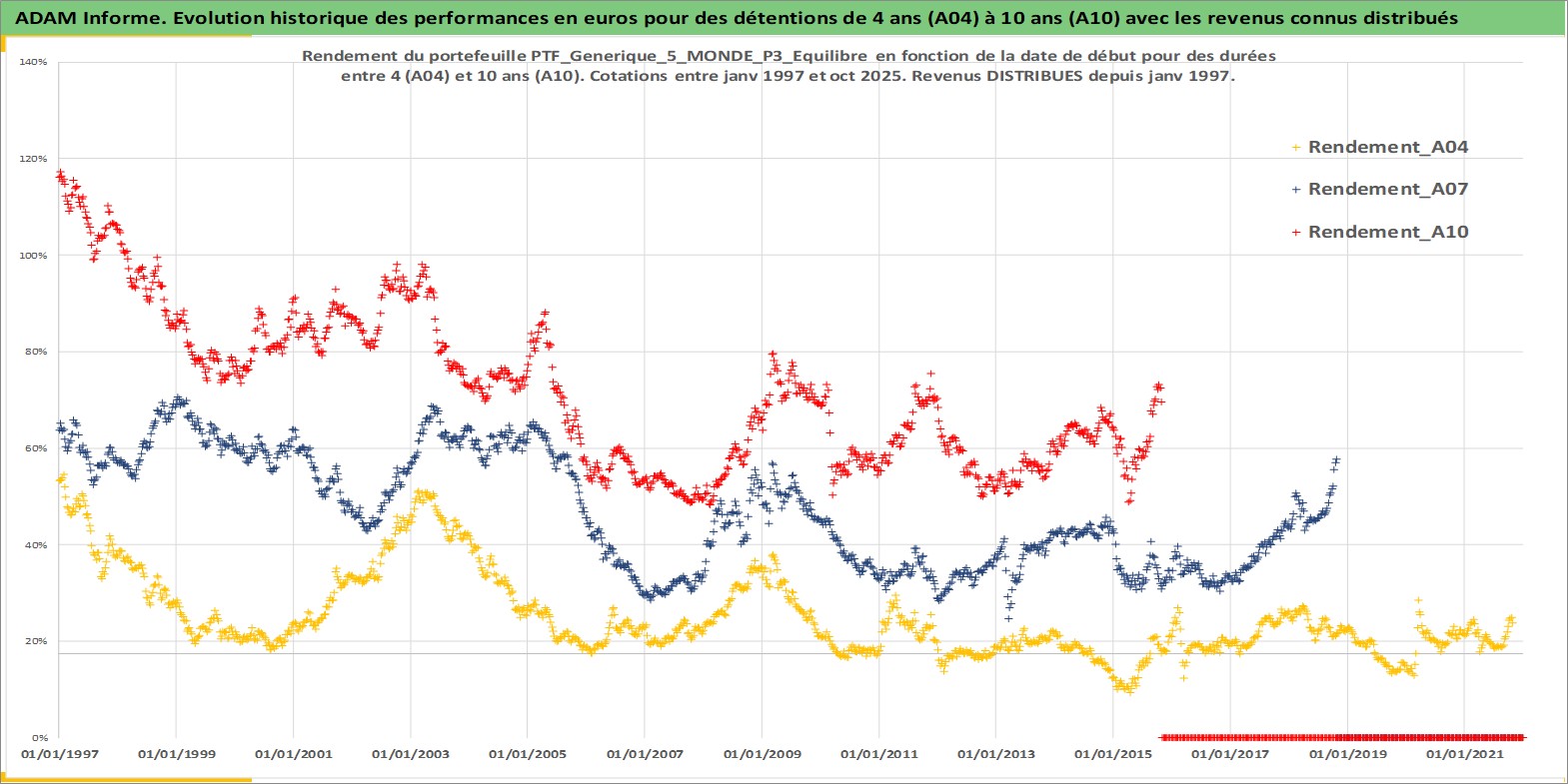 Site dédié aux investisseursPage dédiée sur site financeAnalyse des valorisations hebdomadaires du portefeuille PTF_Generique_5_MONDE_P3_Equilibre_12actifs avec un profil P3_Equilibre. Ce portefeuille est cote en EUR. Les valorisations couvrent les semaines 1997W01 a 2025W44. Les revenus de cet actif financier sont pris en compte depuis la semaine 1997W01. La note ESG de cet actif n'est pas connue.