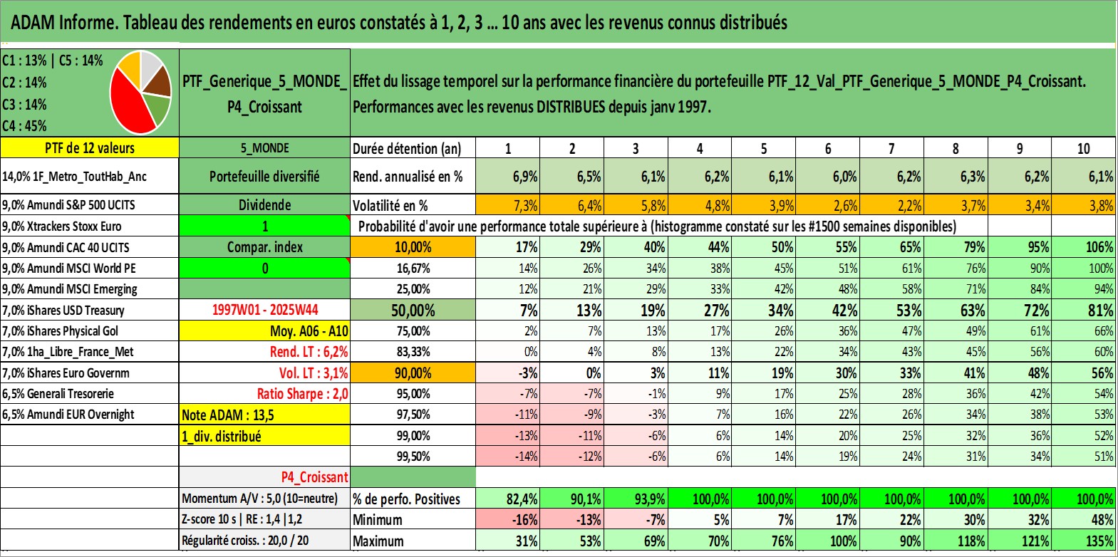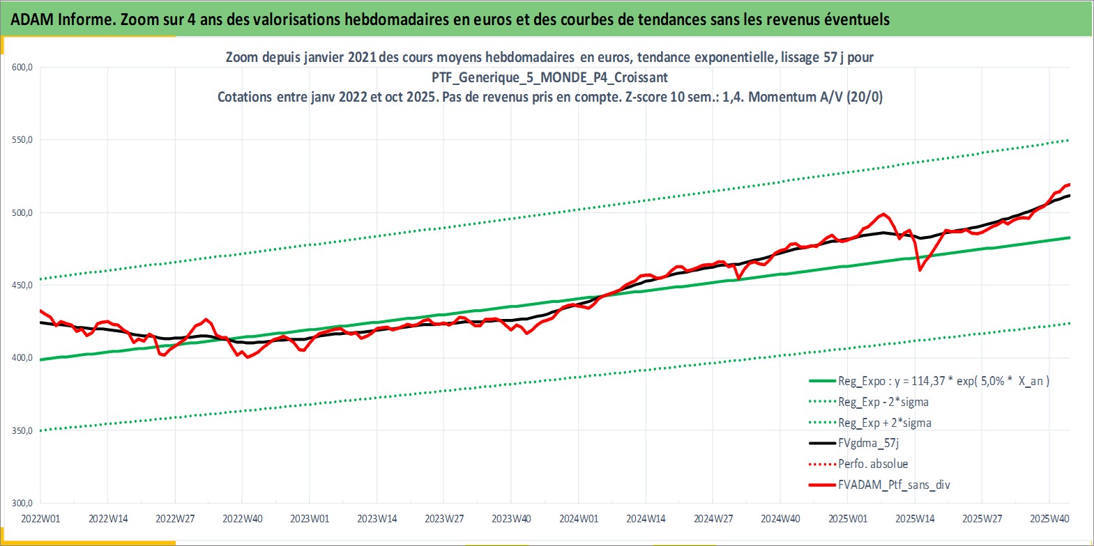 Site dédié aux investisseursPage dédiée sur site financeAnalyse des valorisations hebdomadaires du portefeuille PTF_Generique_5_MONDE_P4_Croissant_12actifs avec un profil P4_Croissant. Ce portefeuille est cote en EUR. Les valorisations couvrent les semaines 1997W01 a 2025W44. Les revenus de cet actif financier sont pris en compte depuis la semaine 1997W01. La note ESG de cet actif n'est pas connue.