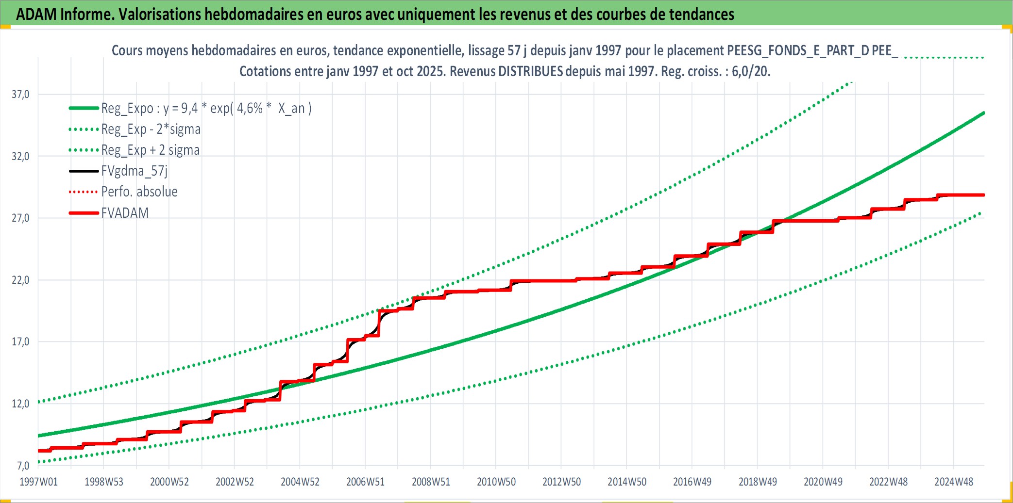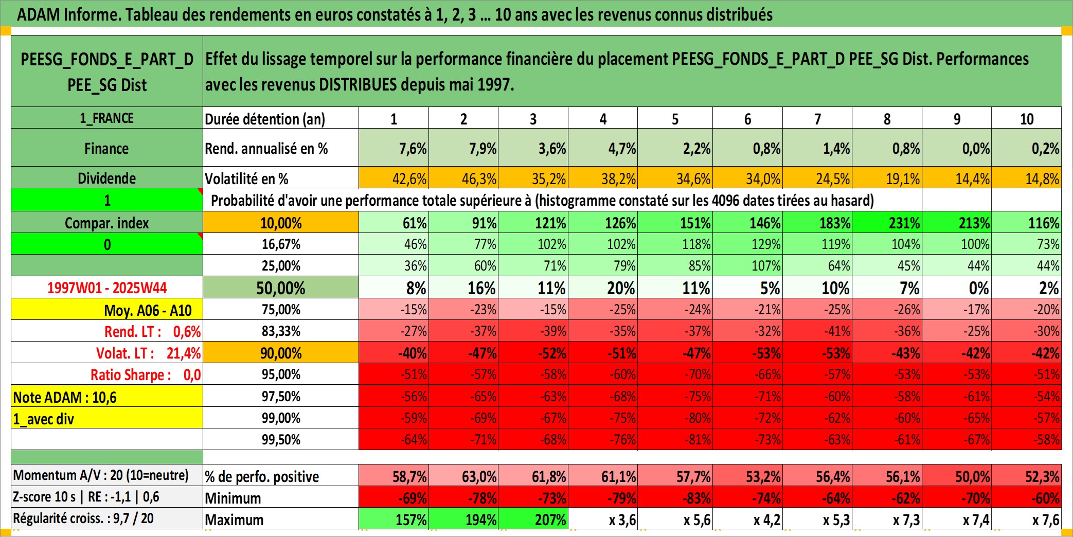 Site dédié aux investisseursPage dédiée sur site financeAnalyse des valorisations hebdomadaires du fonds PEESG_FONDS_E_PART_D PEE_SG Dist. Cet actif est cote en EUR. Les valorisations couvrent les semaines 1997W01 a 2025W44. Les revenus de cet actif financier sont pris en compte depuis la semaine 1997W21. La note ESG de cet actif n'est pas connue.