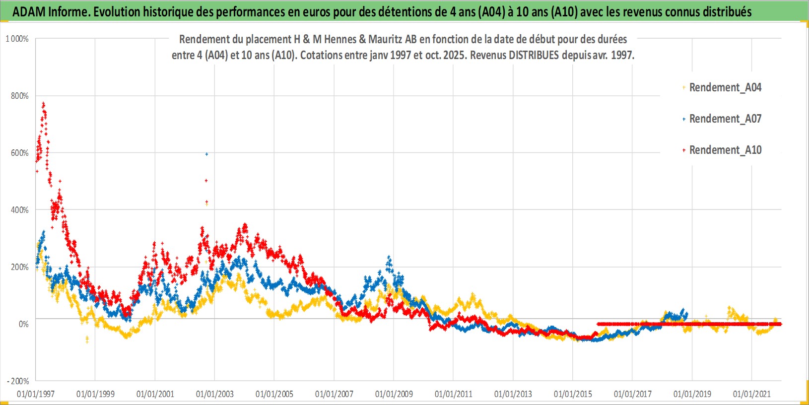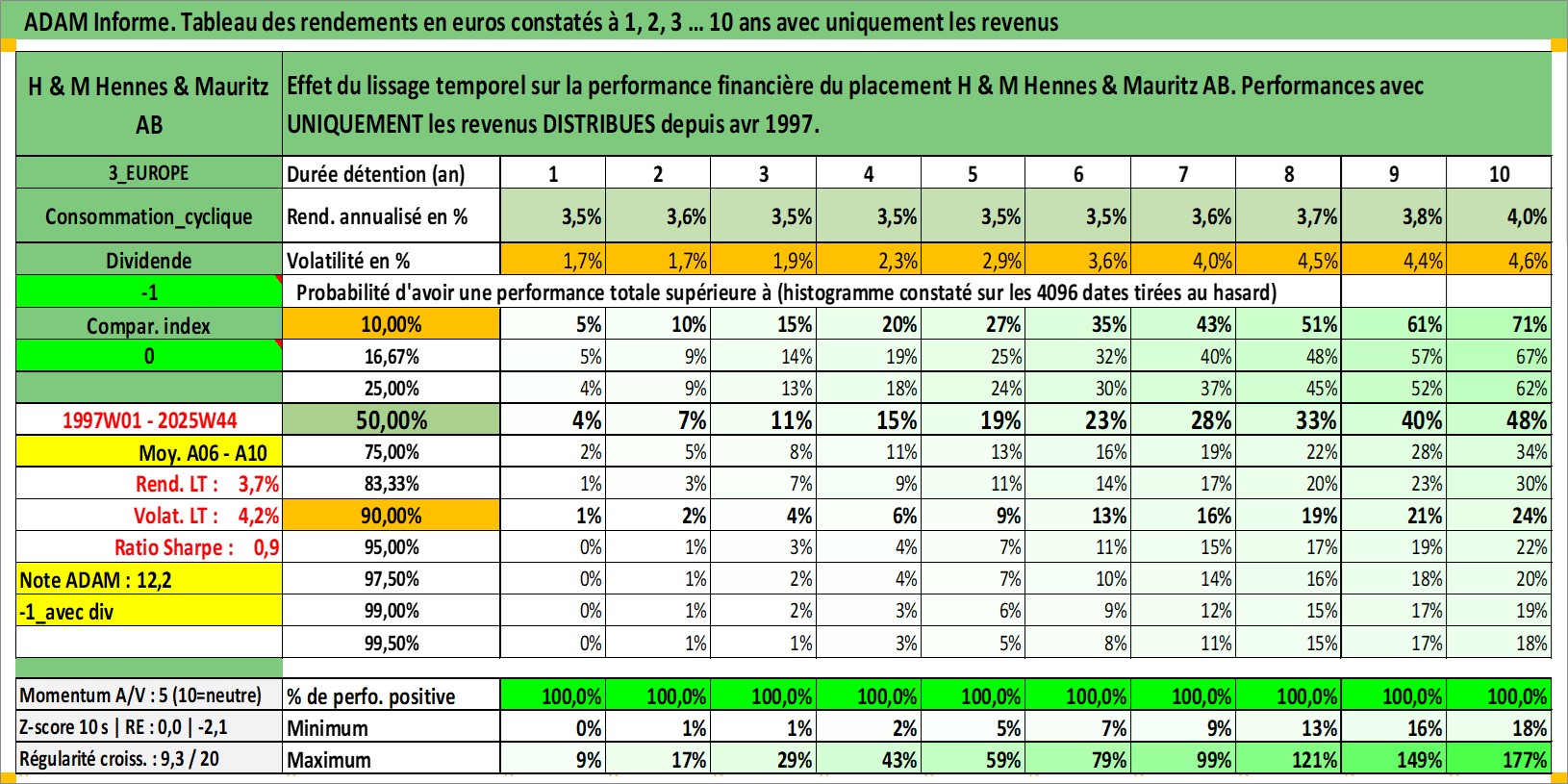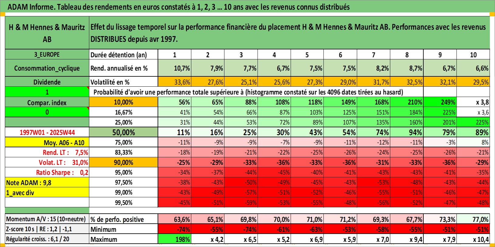 Site dédié aux investisseursPage dédiée sur site financeAnalyse des valorisations hebdomadaires de l'action H & M Hennes & Mauritz AB. Cet actif est cote en SEK. Les valorisations sont en contrevaleur EURO et couvrent les semaines 1997W01 a 2025W44. Les revenus de cet actif financier sont pris en compte depuis la semaine 1997W15. La note globale ESG de cet actif est estimee a 13.0 (apres rebasage entre 0 et 20).