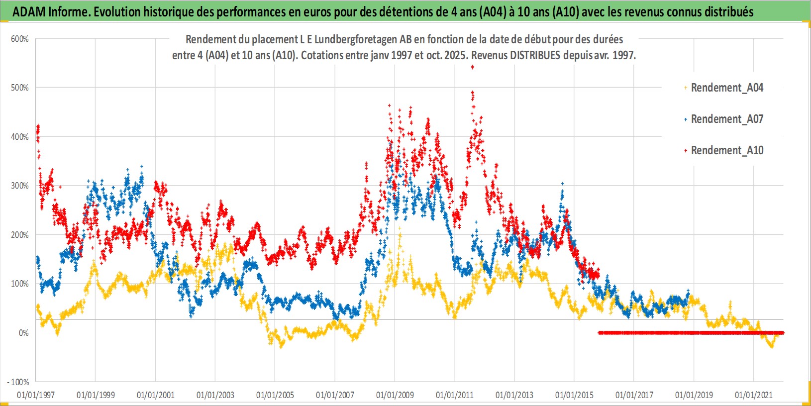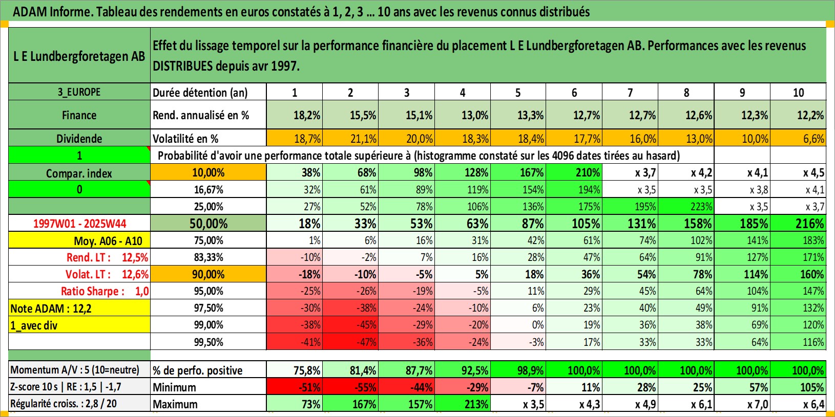 Site dédié aux investisseursPage dédiée sur site financeAnalyse des valorisations hebdomadaires de l'action L E Lundbergforetagen AB. Cet actif est cote en SEK. Les valorisations sont en contrevaleur EURO et couvrent les semaines 1997W01 a 2025W44. Les revenus de cet actif financier sont pris en compte depuis la semaine 1997W17. La note globale ESG de cet actif est estimee a 14.0 (apres rebasage entre 0 et 20).