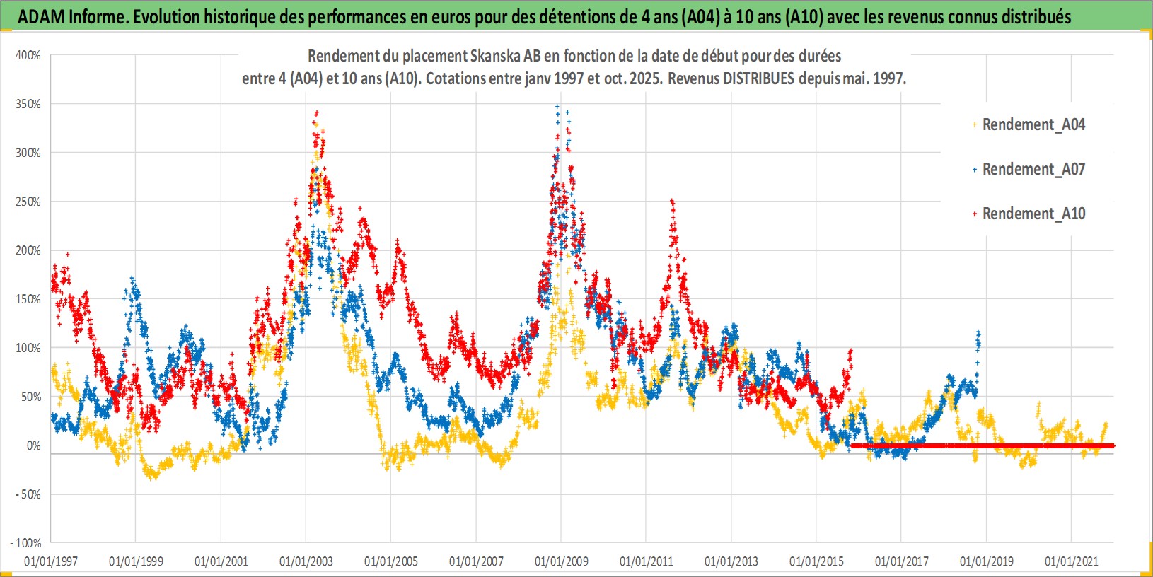 Site dédié aux investisseursPage dédiée sur site financeAnalyse des valorisations hebdomadaires de l'action Skanska AB. Cet actif est cote en SEK. Les valorisations sont en contrevaleur EURO et couvrent les semaines 1997W01 a 2025W44. Les revenus de cet actif financier sont pris en compte depuis la semaine 1997W19. La note globale ESG de cet actif est estimee a 7.0 (apres rebasage entre 0 et 20).