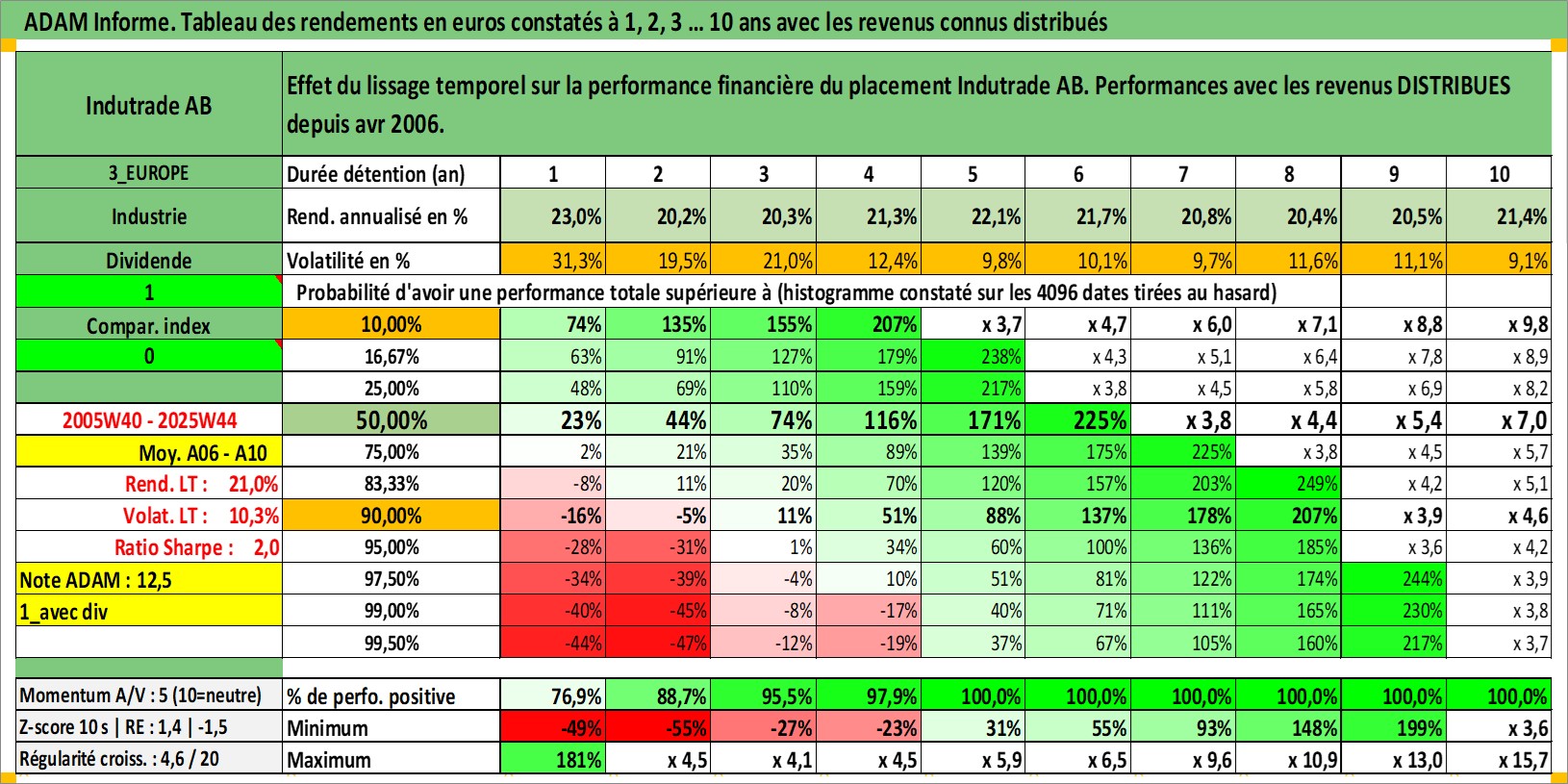 Site dédié aux investisseursPage dédiée sur site financeAnalyse des valorisations hebdomadaires de l'action Indutrade AB. Cet actif est cote en SEK. Les valorisations sont en contrevaleur EURO et couvrent les semaines 2005W40 a 2025W44. Les revenus de cet actif financier sont pris en compte depuis la semaine 2006W17. La note ESG de cet actif n'est pas connue.