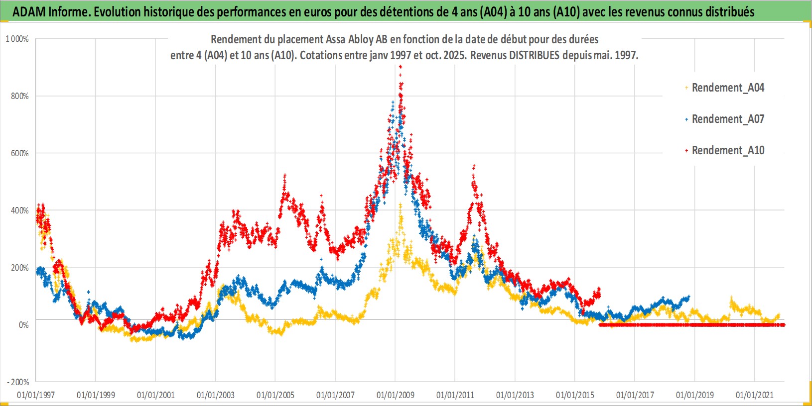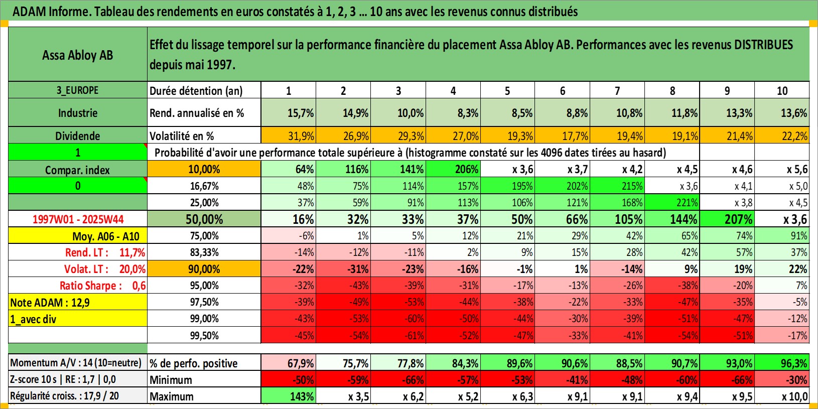 Site dédié aux investisseursPage dédiée sur site financeAnalyse des valorisations hebdomadaires de l'action Assa Abloy AB. Cet actif est cote en SEK. Les valorisations sont en contrevaleur EURO et couvrent les semaines 1997W01 a 2025W44. Les revenus de cet actif financier sont pris en compte depuis la semaine 1997W19. La note globale ESG de cet actif est estimee a 12.0 (apres rebasage entre 0 et 20).