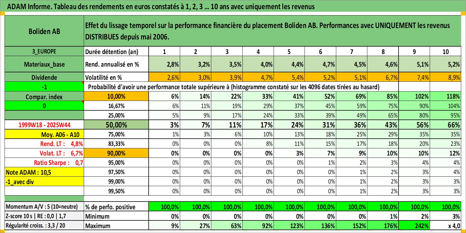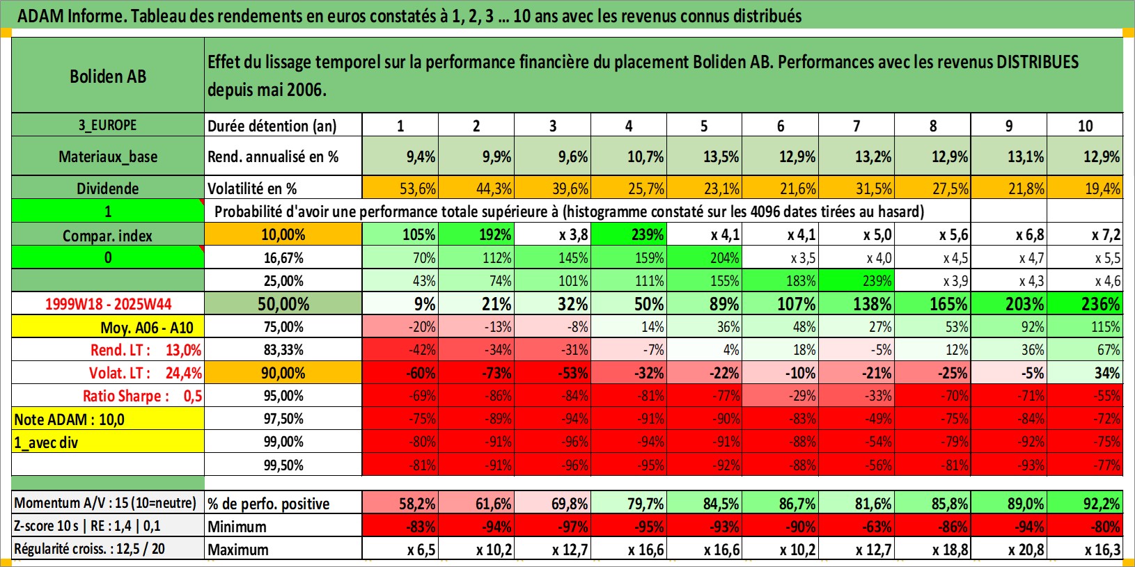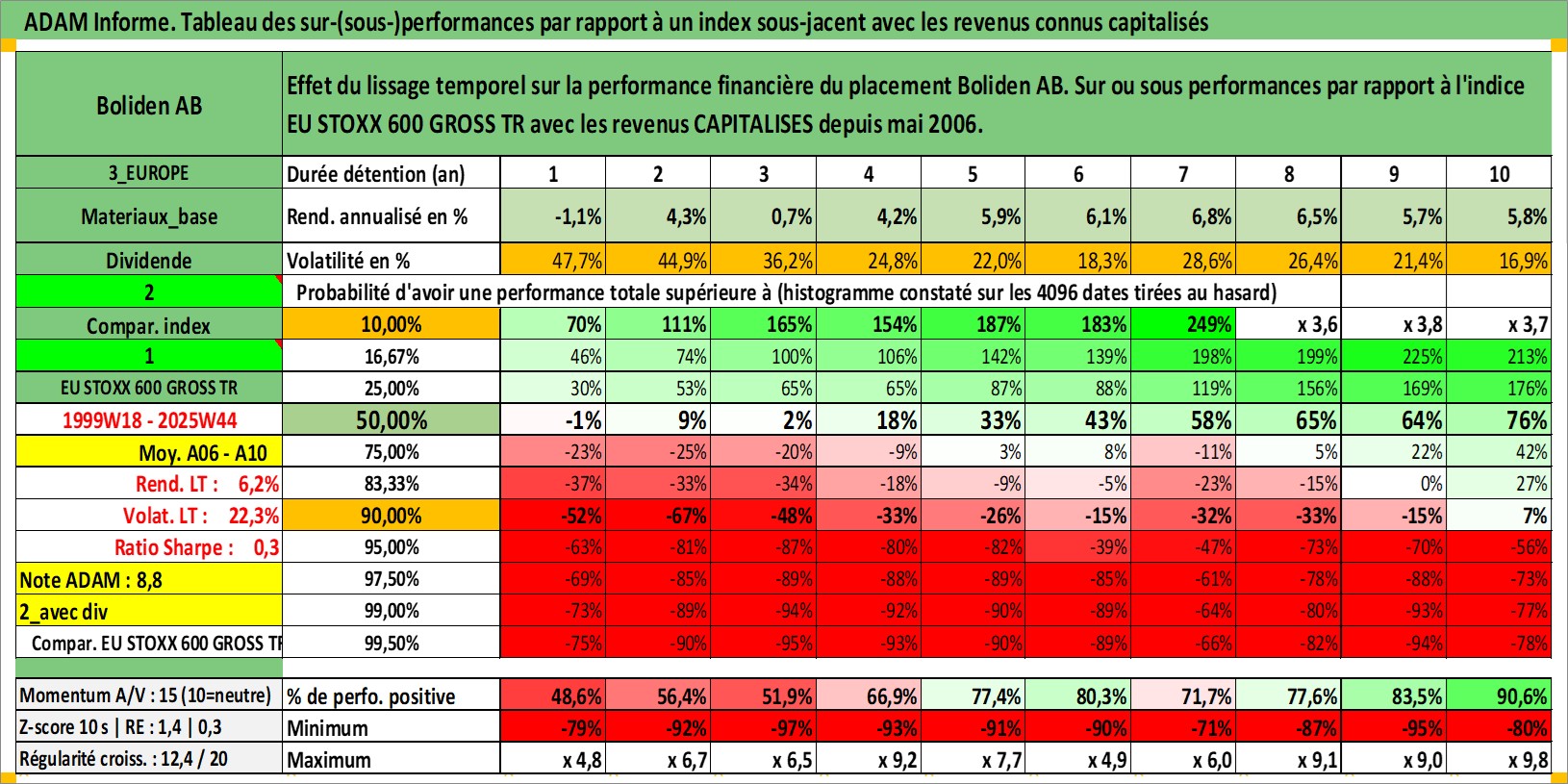 Site dédié aux investisseursPage dédiée sur site financeAnalyse des valorisations hebdomadaires de l'action Boliden AB. Cet actif est cote en SEK. Les valorisations sont en contrevaleur EURO et couvrent les semaines 1999W18 a 2025W44. Les revenus de cet actif financier sont pris en compte depuis la semaine 2006W18. La note globale ESG de cet actif est estimee a 6.0 (apres rebasage entre 0 et 20).