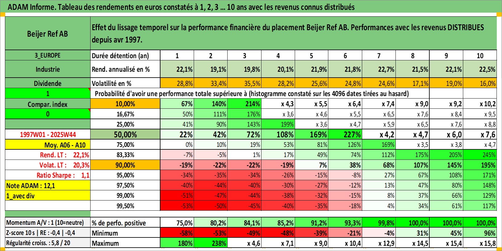 Site dédié aux investisseursPage dédiée sur site financeAnalyse des valorisations hebdomadaires de l'action Beijer Ref AB. Cet actif est cote en SEK. Les valorisations sont en contrevaleur EURO et couvrent les semaines 1997W01 a 2025W44. Les revenus de cet actif financier sont pris en compte depuis la semaine 1997W17. La note globale ESG de cet actif est estimee a 5.0 (apres rebasage entre 0 et 20).
