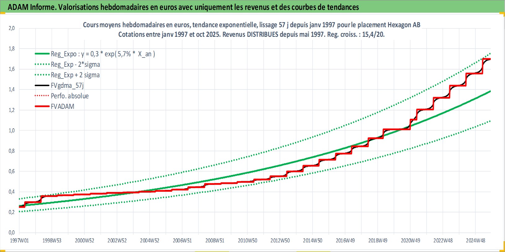 Site dédié aux investisseursPage dédiée sur site financeAnalyse des valorisations hebdomadaires de l'action Hexagon AB. Cet actif est cote en SEK. Les valorisations sont en contrevaleur EURO et couvrent les semaines 1997W01 a 2025W44. Les revenus de cet actif financier sont pris en compte depuis la semaine 1997W19. La note globale ESG de cet actif est estimee a 15.0 (apres rebasage entre 0 et 20).
