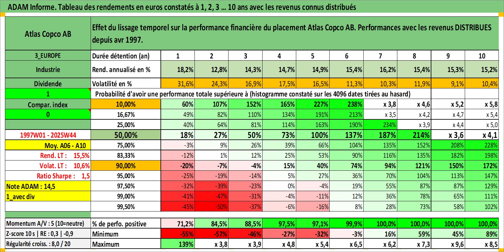 Site dédié aux investisseursPage dédiée sur site financeAnalyse des valorisations hebdomadaires de l'action Atlas Copco AB. Cet actif est cote en SEK. Les valorisations sont en contrevaleur EURO et couvrent les semaines 1997W01 a 2025W44. Les revenus de cet actif financier sont pris en compte depuis la semaine 1997W17. La note globale ESG de cet actif est estimee a 11.0 (apres rebasage entre 0 et 20).