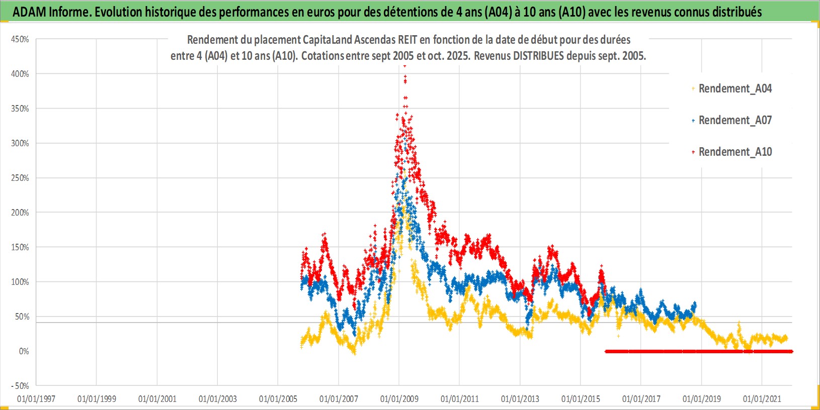 Site dédié aux investisseursPage dédiée sur site financeAnalyse des valorisations hebdomadaires de l'action CapitaLand Ascendas REIT. Cet actif est cote en SGD. Les valorisations sont en contrevaleur EURO et couvrent les semaines 2005W39 a 2025W44. Les revenus de cet actif financier sont pris en compte depuis la semaine 2005W39. La note ESG de cet actif n'est pas connue.