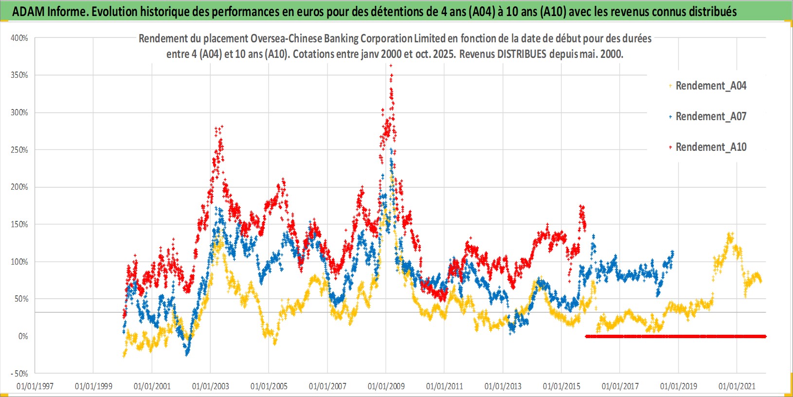 Site dédié aux investisseursPage dédiée sur site financeAnalyse des valorisations hebdomadaires de l'action Oversea-Chinese Banking Corporation Limited. Cet actif est cote en SGD. Les valorisations sont en contrevaleur EURO et couvrent les semaines 2000W01 a 2025W44. Les revenus de cet actif financier sont pris en compte depuis la semaine 2000W18. La note globale ESG de cet actif est estimee a 4.0 (apres rebasage entre 0 et 20).