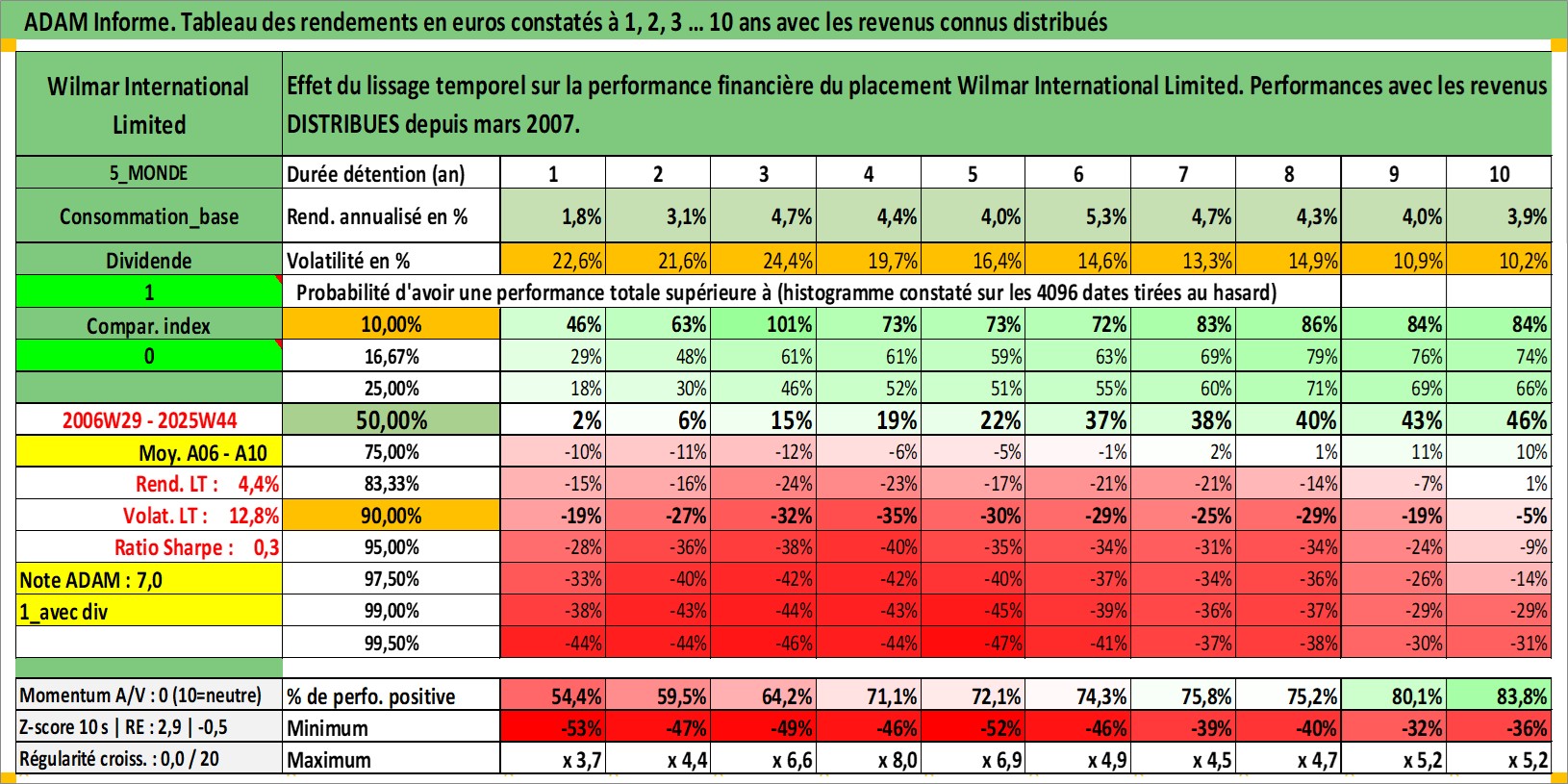 Site dédié aux investisseursPage dédiée sur site financeAnalyse des valorisations hebdomadaires de l'action Wilmar International Limited. Cet actif est cote en SGD. Les valorisations sont en contrevaleur EURO et couvrent les semaines 2006W29 a 2025W44. Les revenus de cet actif financier sont pris en compte depuis la semaine 2007W09. La note globale ESG de cet actif est estimee a 4.0 (apres rebasage entre 0 et 20).