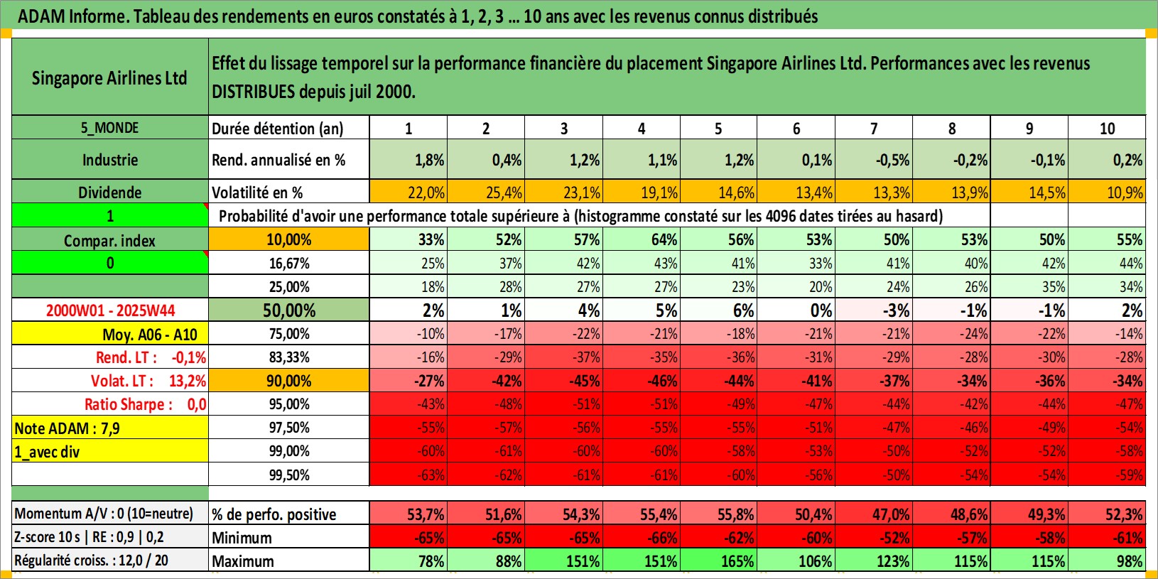 Site dédié aux investisseursPage dédiée sur site financeAnalyse des valorisations hebdomadaires de l'action Singapore Airlines Ltd. Cet actif est cote en SGD. Les valorisations sont en contrevaleur EURO et couvrent les semaines 2000W01 a 2025W44. Les revenus de cet actif financier sont pris en compte depuis la semaine 2000W29. La note globale ESG de cet actif est estimee a 7.0 (apres rebasage entre 0 et 20).