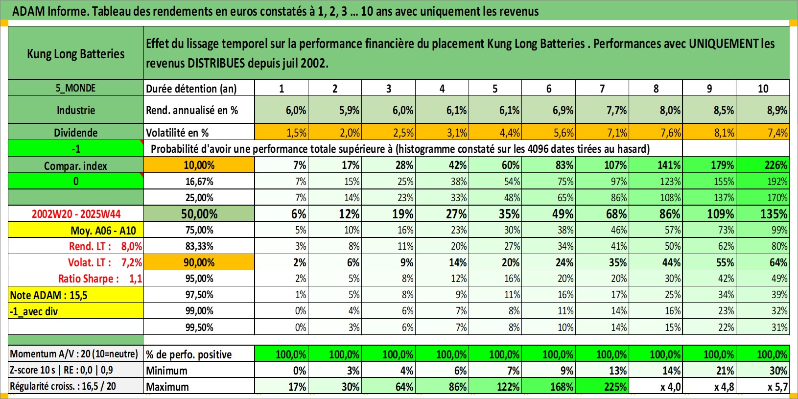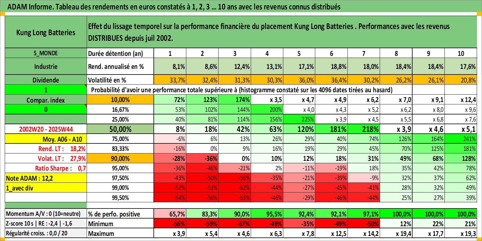Site dédié aux investisseursPage dédiée sur site financeAnalyse des valorisations hebdomadaires de l'action Kung Long Batteries . Cet actif est cote en TWD. Les valorisations sont en contrevaleur EURO et couvrent les semaines 2002W20 a 2025W44. Les revenus de cet actif financier sont pris en compte depuis la semaine 2002W28. La note ESG de cet actif n'est pas connue.