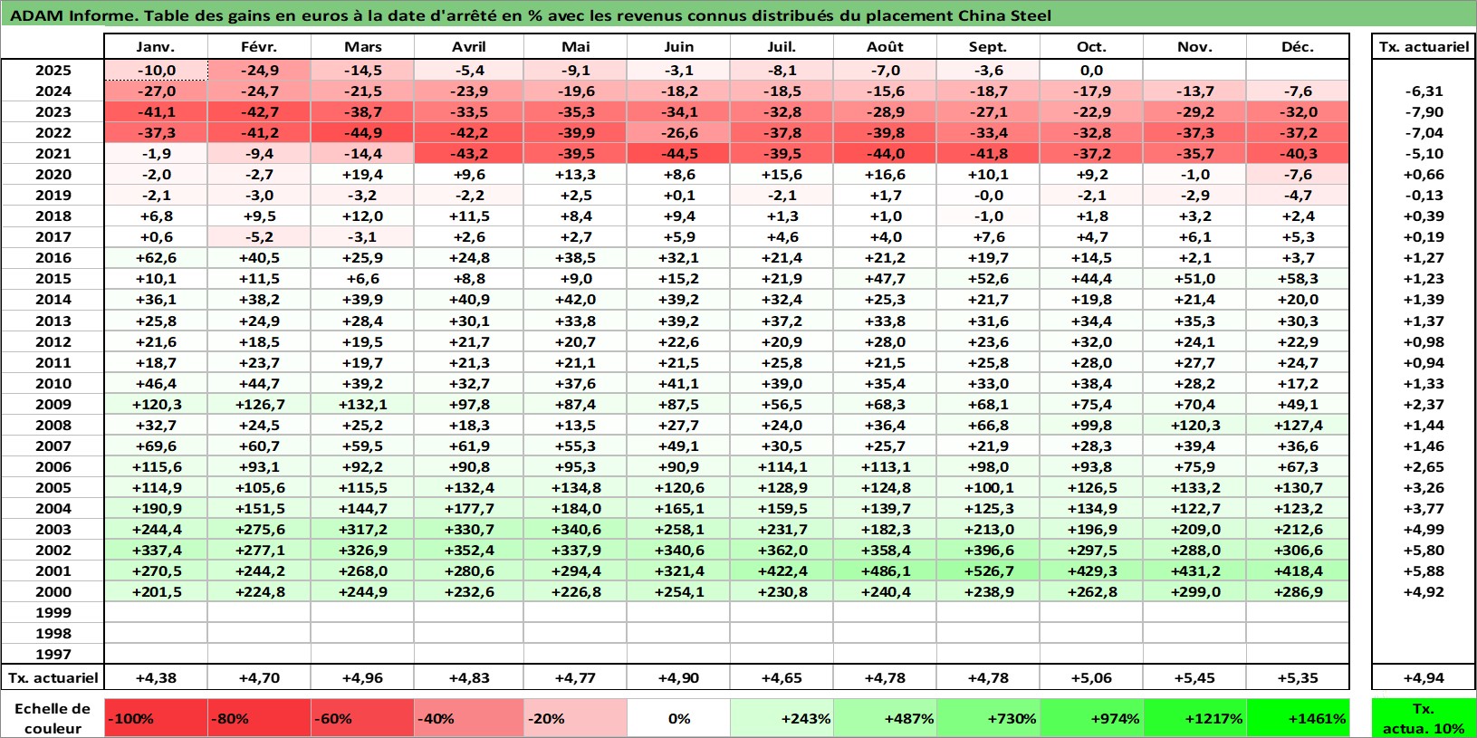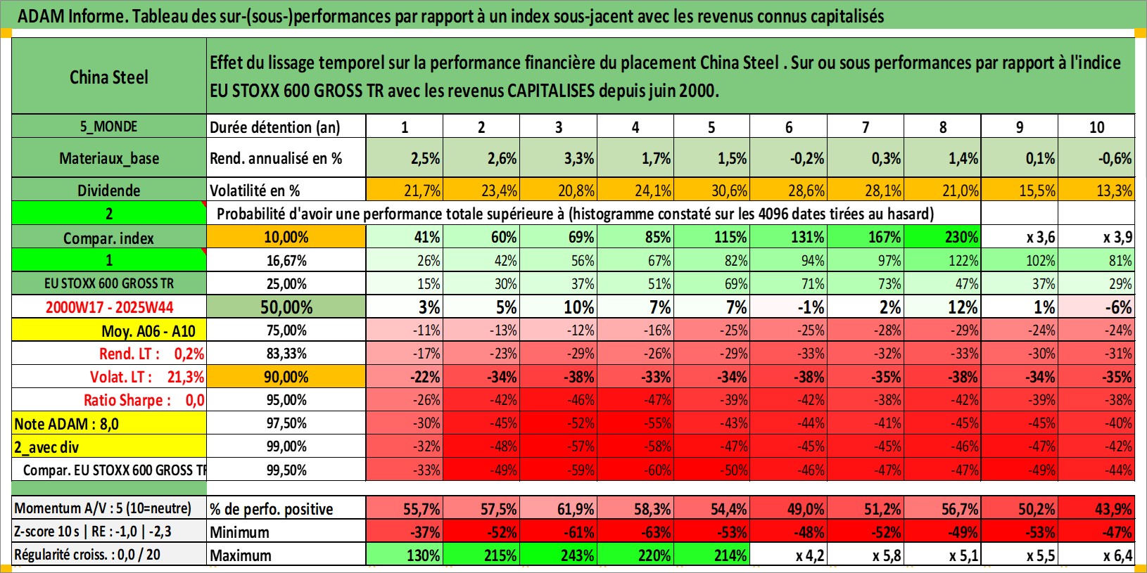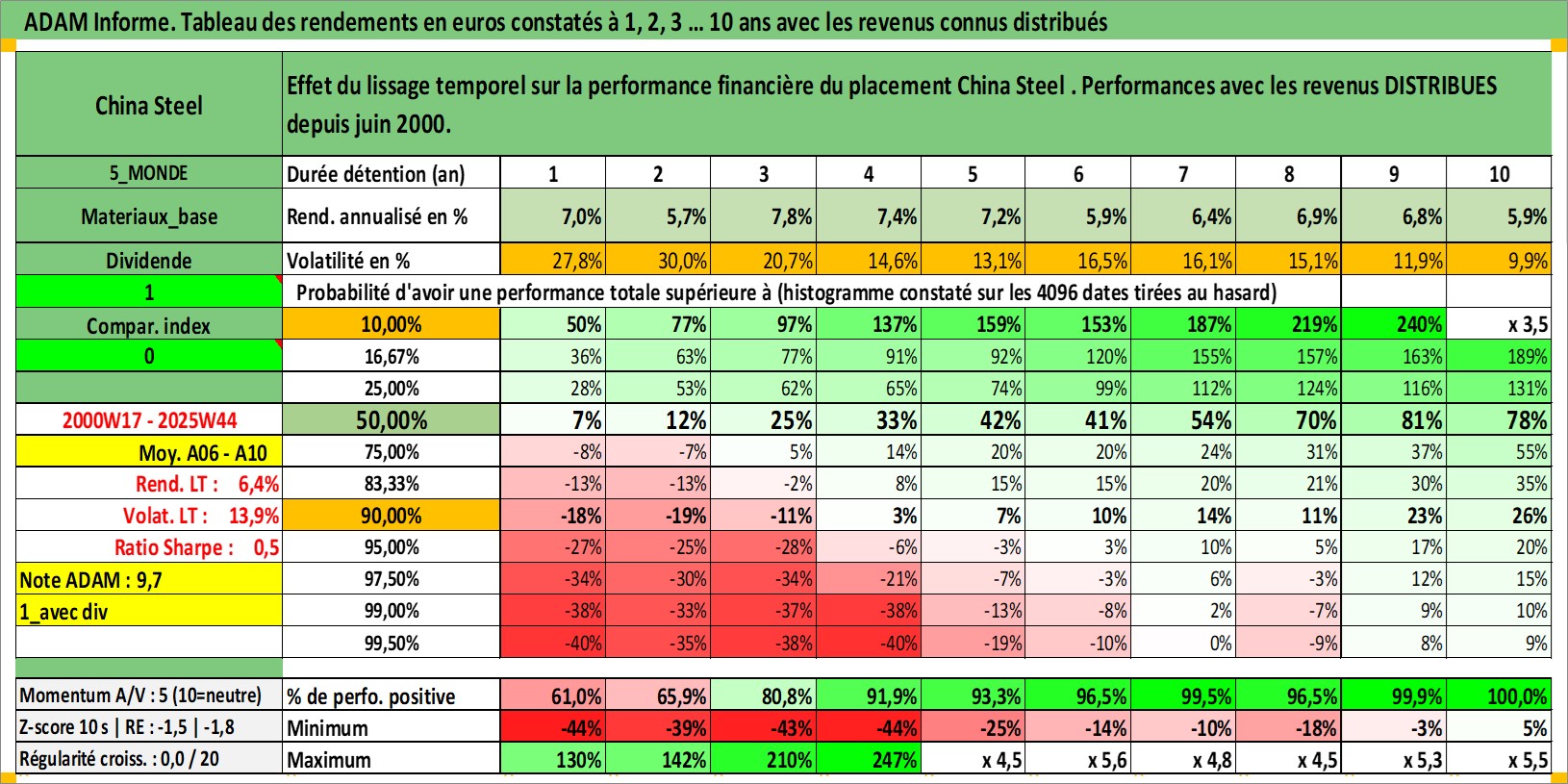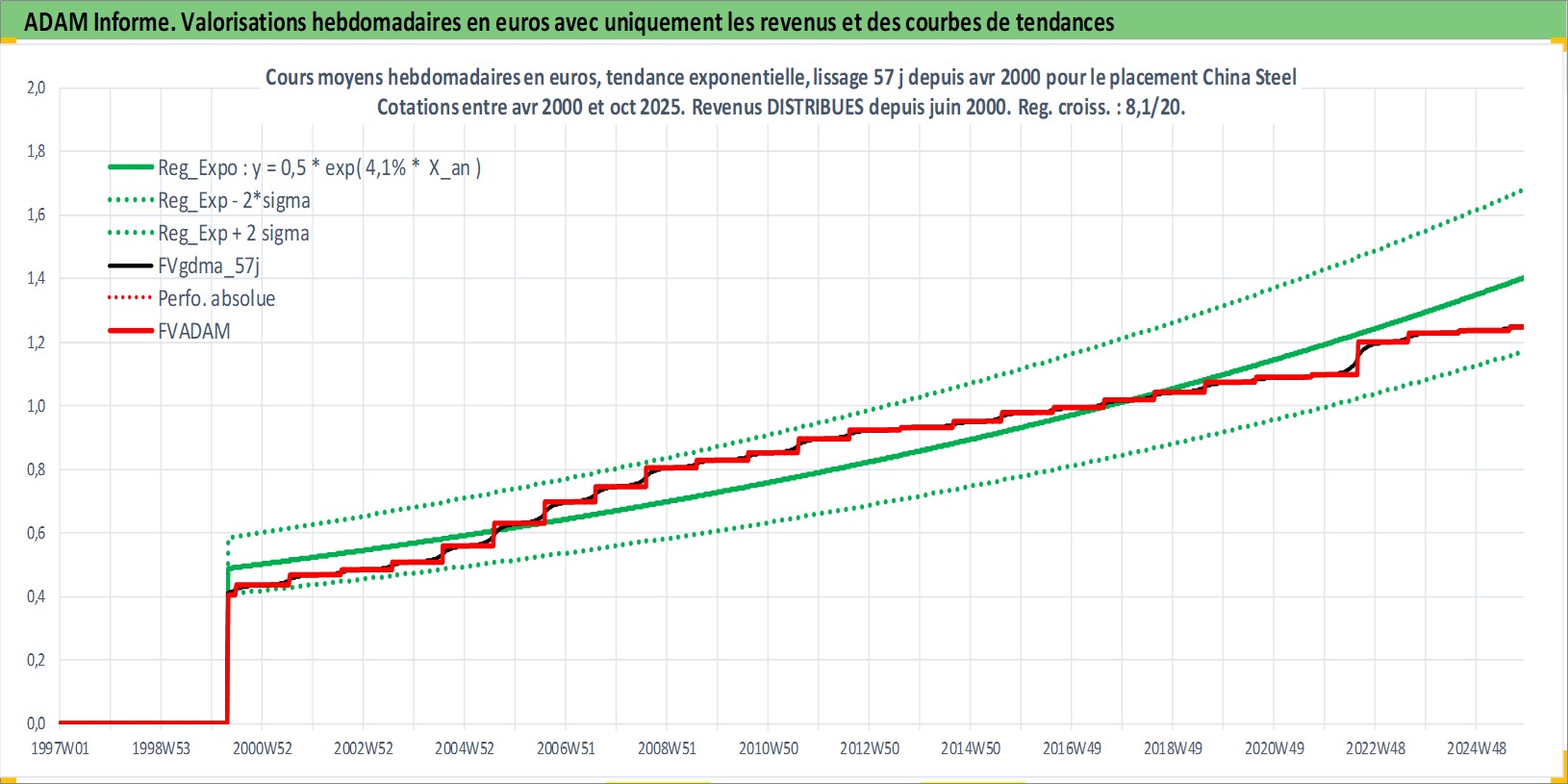 Site dédié aux investisseursPage dédiée sur site financeAnalyse des valorisations hebdomadaires de l'action China Steel . Cet actif est cote en TWD. Les valorisations sont en contrevaleur EURO et couvrent les semaines 2000W17 a 2025W44. Les revenus de cet actif financier sont pris en compte depuis la semaine 2000W25. La note globale ESG de cet actif est estimee a 5.0 (apres rebasage entre 0 et 20).