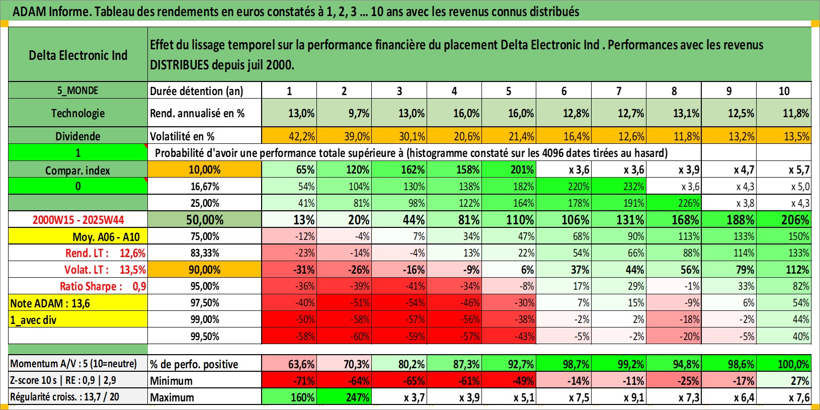 Site dédié aux investisseursPage dédiée sur site financeAnalyse des valorisations hebdomadaires de l'action Delta Electronic Ind . Cet actif est cote en TWD. Les valorisations sont en contrevaleur EURO et couvrent les semaines 2000W15 a 2025W44. Les revenus de cet actif financier sont pris en compte depuis la semaine 2000W28. La note globale ESG de cet actif est estimee a 11.0 (apres rebasage entre 0 et 20).