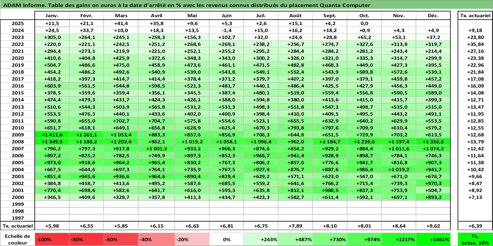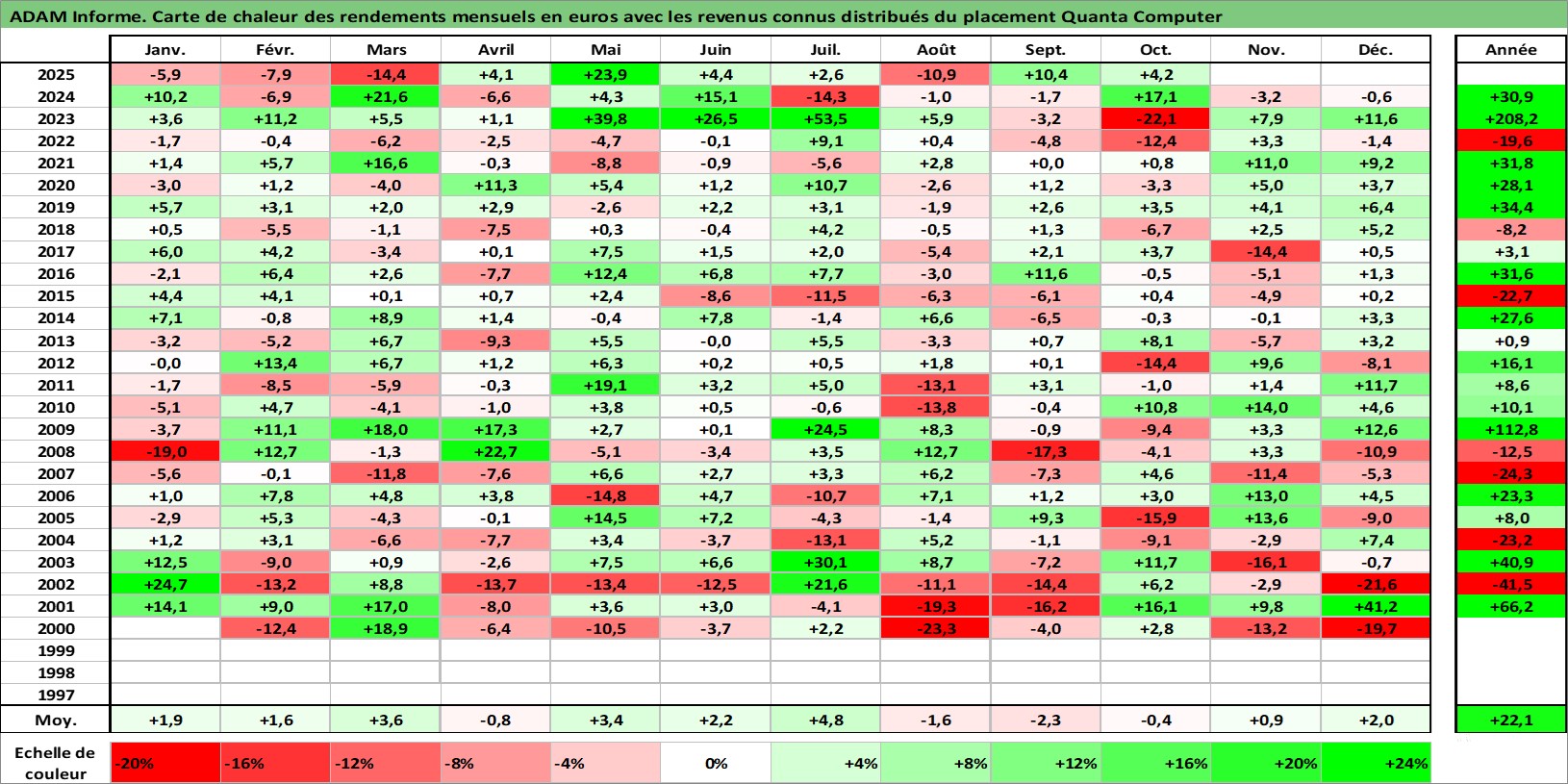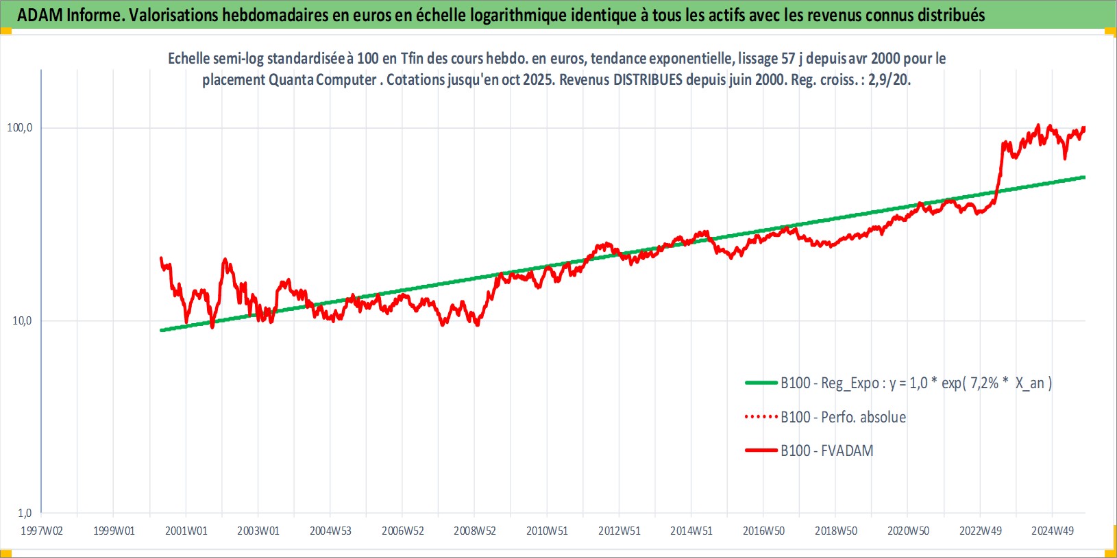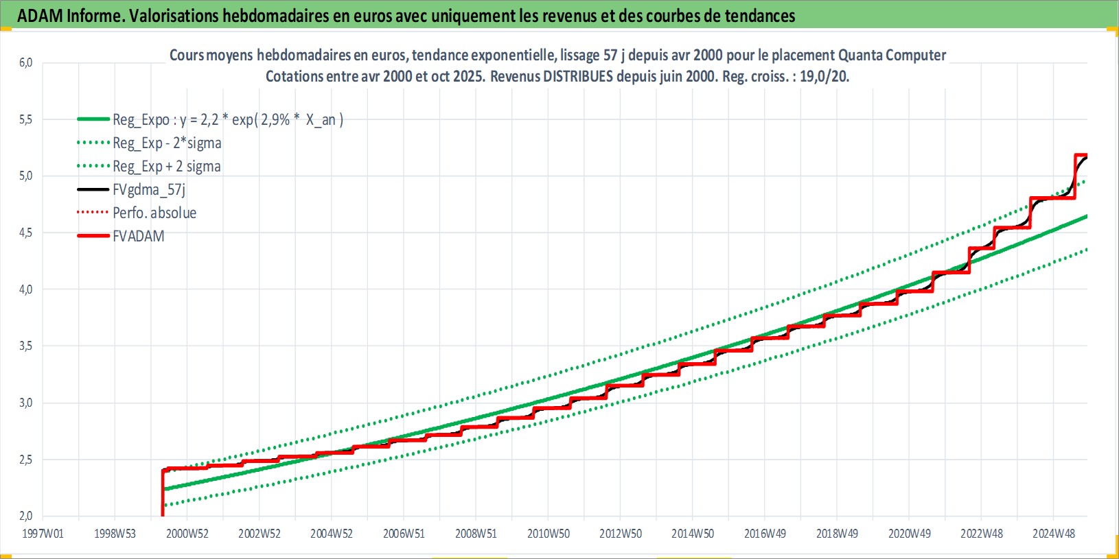 Site dédié aux investisseursPage dédiée sur site financeAnalyse des valorisations hebdomadaires de l'action Quanta Computer . Cet actif est cote en TWD. Les valorisations sont en contrevaleur EURO et couvrent les semaines 2000W17 a 2025W44. Les revenus de cet actif financier sont pris en compte depuis la semaine 2000W24. La note globale ESG de cet actif est estimee a 9.0 (apres rebasage entre 0 et 20).