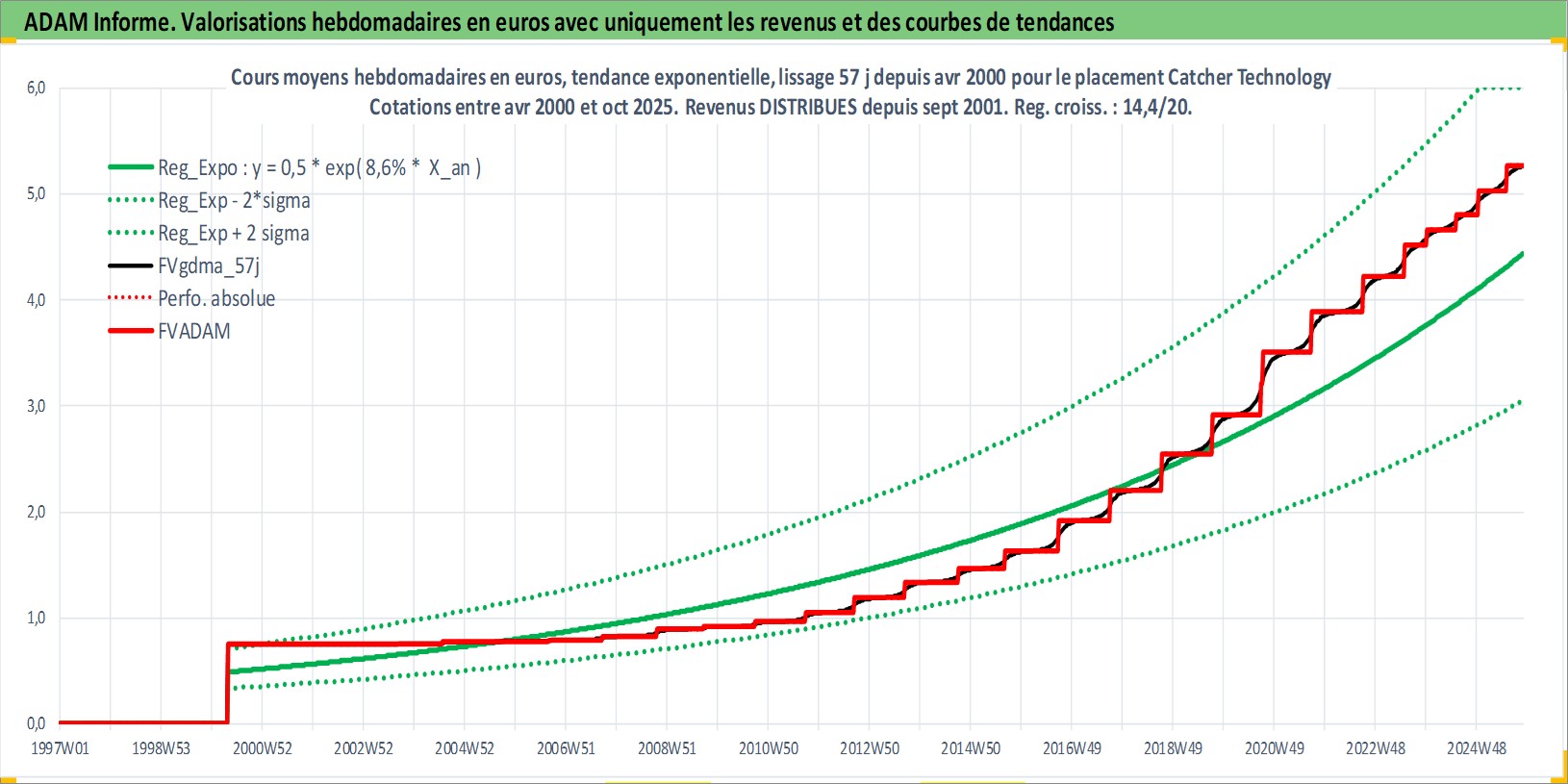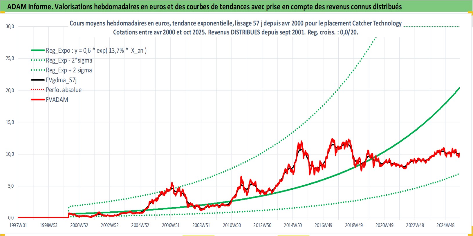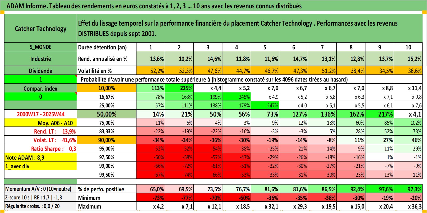 Site dédié aux investisseursPage dédiée sur site financeAnalyse des valorisations hebdomadaires de l'action Catcher Technology . Cet actif est cote en TWD. Les valorisations sont en contrevaleur EURO et couvrent les semaines 2000W17 a 2025W44. Les revenus de cet actif financier sont pris en compte depuis la semaine 2001W36. La note globale ESG de cet actif est estimee a 12.0 (apres rebasage entre 0 et 20).
