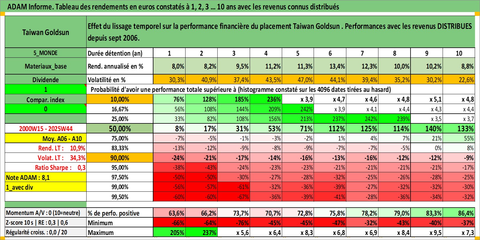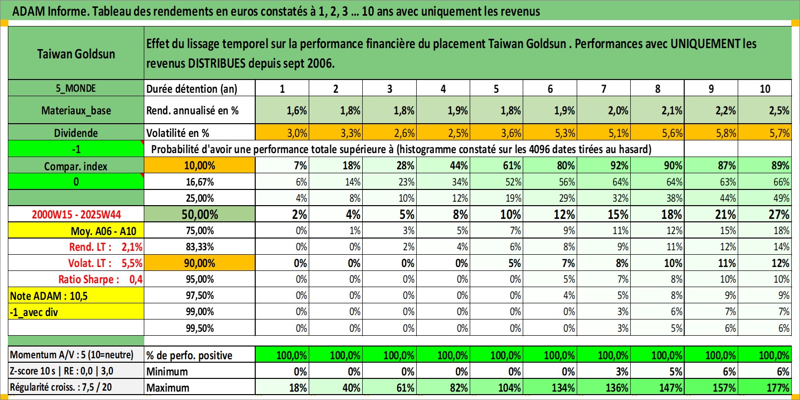 Site dédié aux investisseursPage dédiée sur site financeAnalyse des valorisations hebdomadaires de l'action Taiwan Goldsun . Cet actif est cote en TWD. Les valorisations sont en contrevaleur EURO et couvrent les semaines 2000W15 a 2025W44. Les revenus de cet actif financier sont pris en compte depuis la semaine 2006W37. La note ESG de cet actif n'est pas connue.