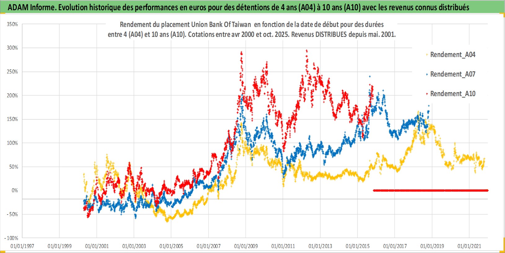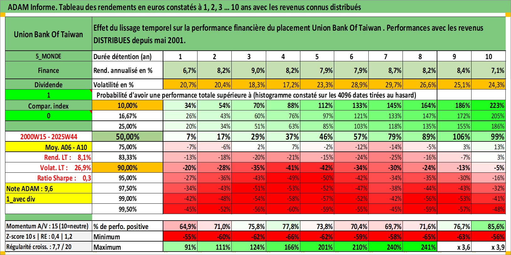 Site dédié aux investisseursPage dédiée sur site financeAnalyse des valorisations hebdomadaires de l'action Union Bank Of Taiwan . Cet actif est cote en TWD. Les valorisations sont en contrevaleur EURO et couvrent les semaines 2000W15 a 2025W44. Les revenus de cet actif financier sont pris en compte depuis la semaine 2001W20. La note ESG de cet actif n'est pas connue.